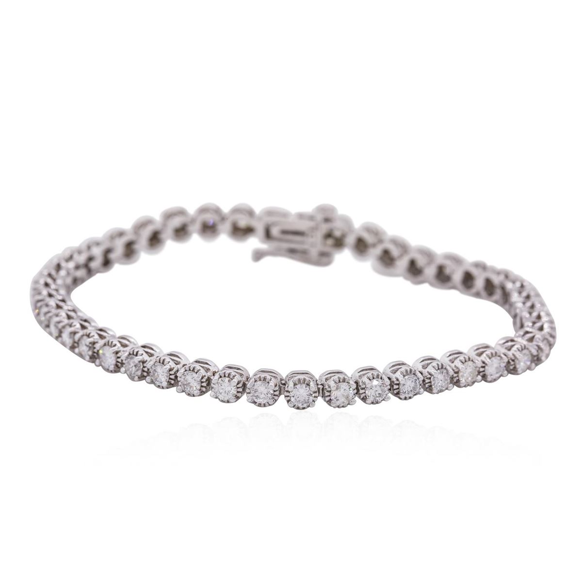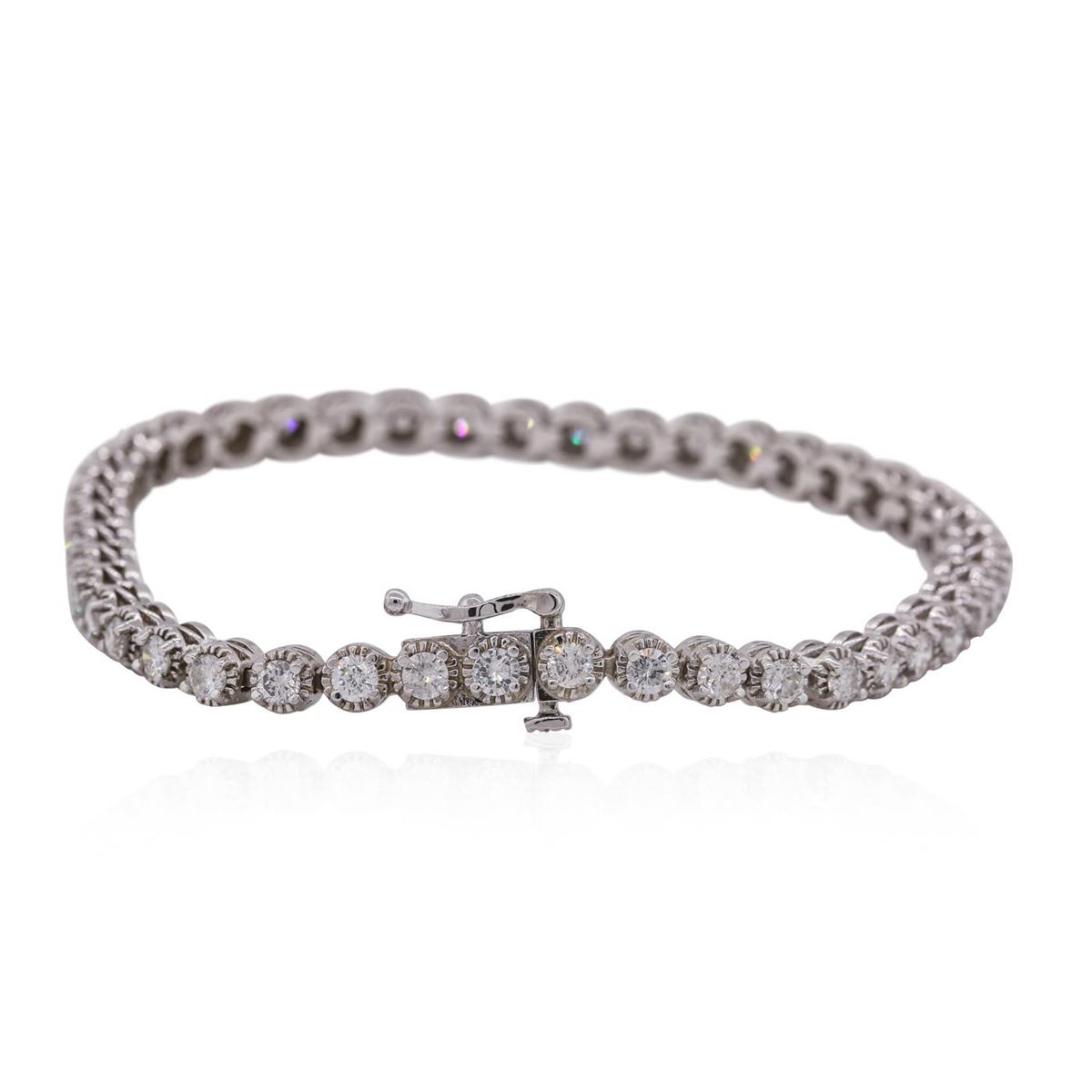 One electronically tested 14KT white gold ladies combination cast & assembled diamond tennis bracelet with a hidden box clasp with safety closer with a bright polish finish. Measurements: 7 in length. Identified with markings of 14K. Condition is new. Containing: Forty-Four prong set round brilliant cut diamonds, measuring 2.40 - 2.40 x 1.44mm (depth est.) approximate total weight of 44 Stones = 2.23ct. Clarity: SI-1 to I-1. Color: H - J, Cut is Good. All diamonds are graded in the mounting, unless otherwise stated. Total Weight of Diamonds 2.23ct. Total Weight of Tennis Bracelet 11.76 grams. GGL Appraised at $7,380.00.