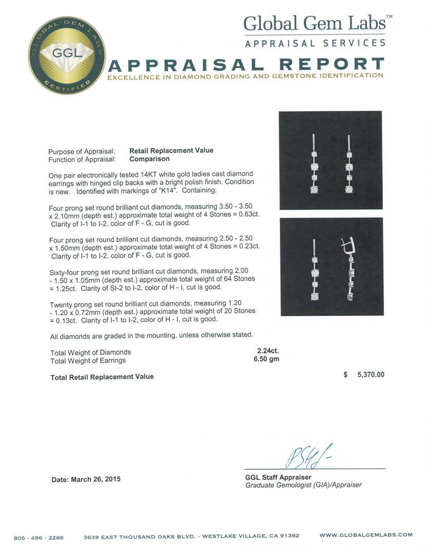 One pair electronically tested 14KT white gold ladies cast diamond earrings with hinged clip backs with a bright polish finish. Identified with markings of "K14". Condition is new. Containing: Four prong set round brilliant cut diamonds, measuring 3.50 - 3.50 x 2.10mm (depth est.) approximate total weight of 4 Stones = 0.63ct. Clarity: I-1 to I-2. Color: F - G, Cut is Good. Four prong set round brilliant cut diamonds, measuring 2.50 - 2.50 x 1.50mm (depth est.) approximate total weight of 4 Stones = 0.23ct. Clarity: I-1 to I-2. Color: F - G, Cut is Good. Sixty-Four prong set round brilliant cut diamonds, measuring 2.00 - 1.50 x 1.05mm (depth est.) approximate total weight of 64 Stones = 1.25ct. Clarity: SI-2 to I-2. Color: H - I, Cut is Good. Twenty prong set round brilliant cut diamonds, measuring 1.20 - 1.20 x 0.72mm (depth est.) approximate total weight of 20 Stones = 0.13ct. Clarity: I-1 to I-2. Color: H - I, Cut is Good. All diamonds are graded in the mounting, unless otherwise stated. Total Weight of Diamonds 2.24ct. Total Weight of Earrings 6.50 grams. GGL Appraised at $5,370.00.