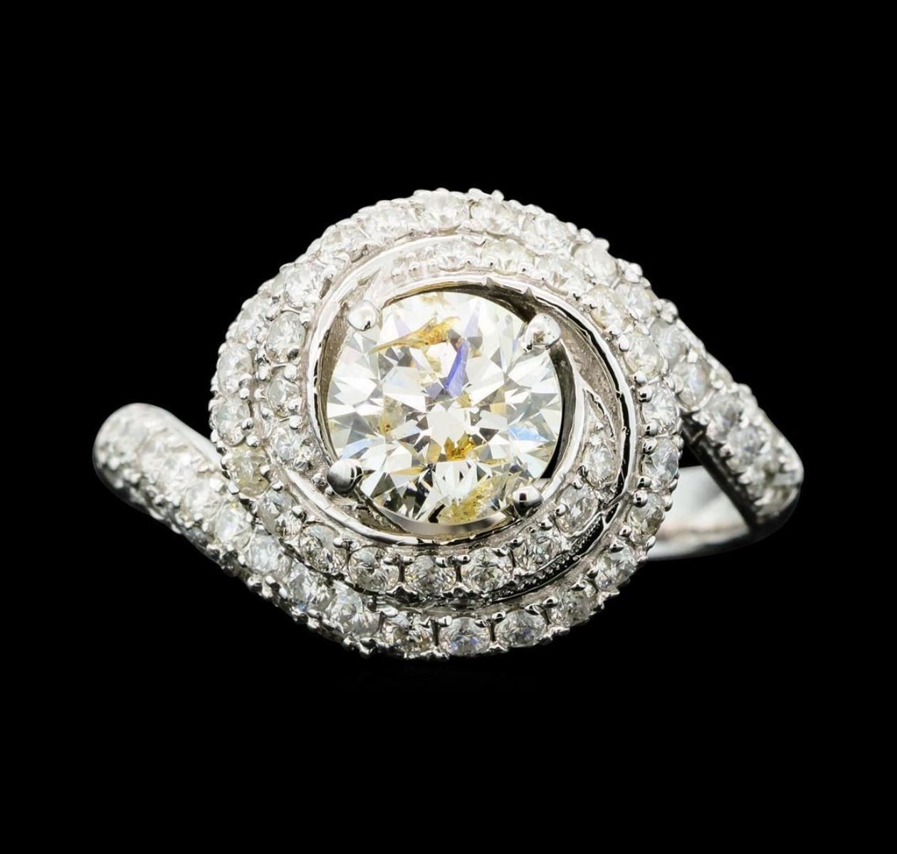 One electronically tested 14KT white gold lady's cast wedding ring with a swirled halo with a bright polish finish. The featured lady's ring has a shank measuring 2.35 millimeters wide. Identified with markings of "K14". Condition is new, good workmanship. Estimated Retail Value: $11740.00 GAS Appraised.