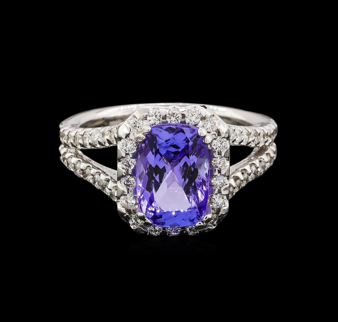 One electronically tested 14KT white gold ladies cast tanzanite and diamond ring with a bright polish finish. Identified with markings of "K14". Condition is new. Containing: One prong set rectangular cushion modified brilliant cut natural tanzanite, measuring 10.00 x 6.50 x 4.38mm, approximate weight of 2.24ct., clarity is eye clean, type I, medium light, very slightly grayish, violet color, (GIA V 4/3), cut is good. Fifty-Four prong set round brilliant cut diamonds, measuring 1.50 - 1.50 x 0.90mm (depth est.) approximate total weight of 54 Stones = 0.66ct. Clarity: SI-2 to I-2. Color: I - J, Cut is Good. Colored gemstones are presumed to have been subjected to commonly used enhancement processes. All diamonds and colored gemstones are graded in the mounting, unless otherwise stated. Total Weight of Colored Stones 2.24ct. Total Weight of Diamonds 0.66ct. Total Weight of Ring 7.60 grams. GGL Appraised at $4,975.00.