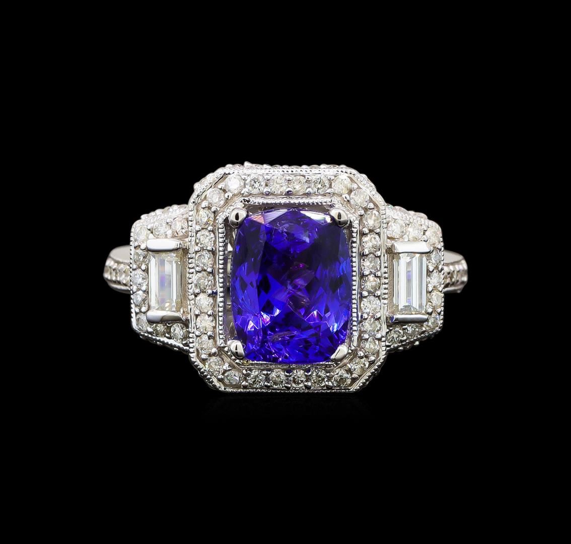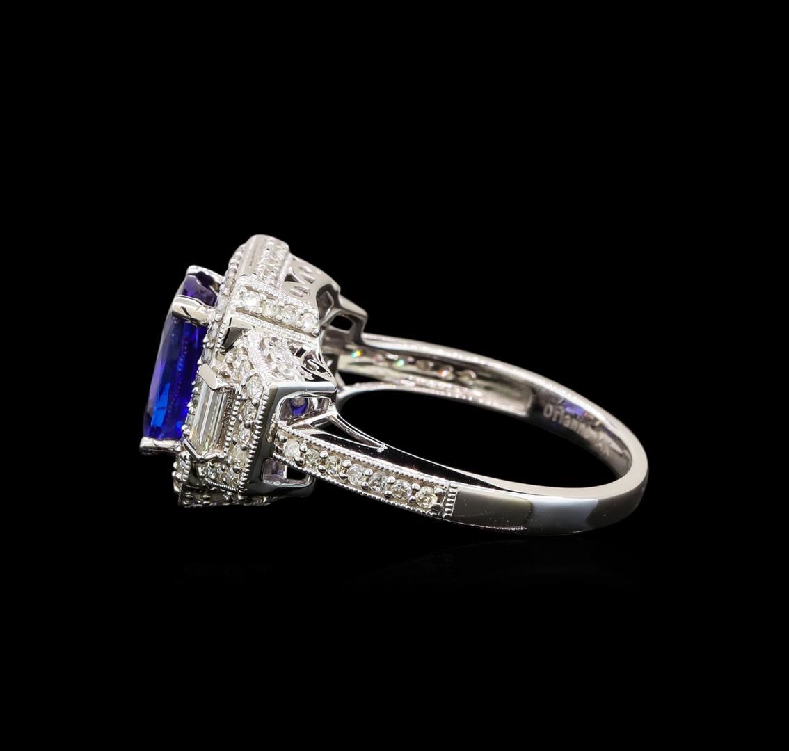 One electronically tested 14KT white gold ladies cast tanzanite and diamond ring with a flat shank with a bright polish finish. Trademark is Orianne. Identified with markings of "14K". Condition is new. Containing: One prong set rectangular cushion modified brilliant cut natural tanzanite, measuring 8.82 x 7.00 x 4.61mm, approximate weight of 2.24ct., clarity is eye clean, type I, medium, moderately strong, violetish blue color, (GIA vB 5/4), cut is good. Seventy-Four prong set round brilliant cut diamonds, measuring 1.00 - 1.00 x 0.60mm (depth est.) approximate total weight of 74 Stones = 0.27ct. Clarity: I-1 to I-2. Color: I - J. Two prong set baguette cut diamonds, measuring 3.50 x 2.00 x 1.70mm (depth est.) approximate total weight of 2 Stones = 0.22ct. Clarity: SI-1. Color: I. All diamonds and colored gemstones are graded in the mounting, unless otherwise stated. Colored gemstones are presumed to have been subjected to commonly used enhancement processes.. Total Weight of Colored Stones 2.24ct. Total Weight of Diamonds 0.48ct. Total Weight of Ring 5.50 grams. GGL Appraised at $4,750.00.