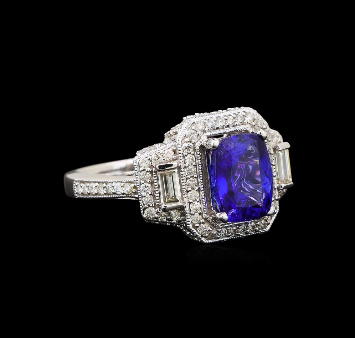 One electronically tested 14KT white gold ladies cast tanzanite and diamond ring with a flat shank with a bright polish finish. Trademark is Orianne. Identified with markings of "14K". Condition is new. Containing: One prong set rectangular cushion modified brilliant cut natural tanzanite, measuring 8.82 x 7.00 x 4.61mm, approximate weight of 2.24ct., clarity is eye clean, type I, medium, moderately strong, violetish blue color, (GIA vB 5/4), cut is good. Seventy-Four prong set round brilliant cut diamonds, measuring 1.00 - 1.00 x 0.60mm (depth est.) approximate total weight of 74 Stones = 0.27ct. Clarity: I-1 to I-2. Color: I - J. Two prong set baguette cut diamonds, measuring 3.50 x 2.00 x 1.70mm (depth est.) approximate total weight of 2 Stones = 0.22ct. Clarity: SI-1. Color: I. All diamonds and colored gemstones are graded in the mounting, unless otherwise stated. Colored gemstones are presumed to have been subjected to commonly used enhancement processes.. Total Weight of Colored Stones 2.24ct. Total Weight of Diamonds 0.48ct. Total Weight of Ring 5.50 grams. GGL Appraised at $4,750.00.