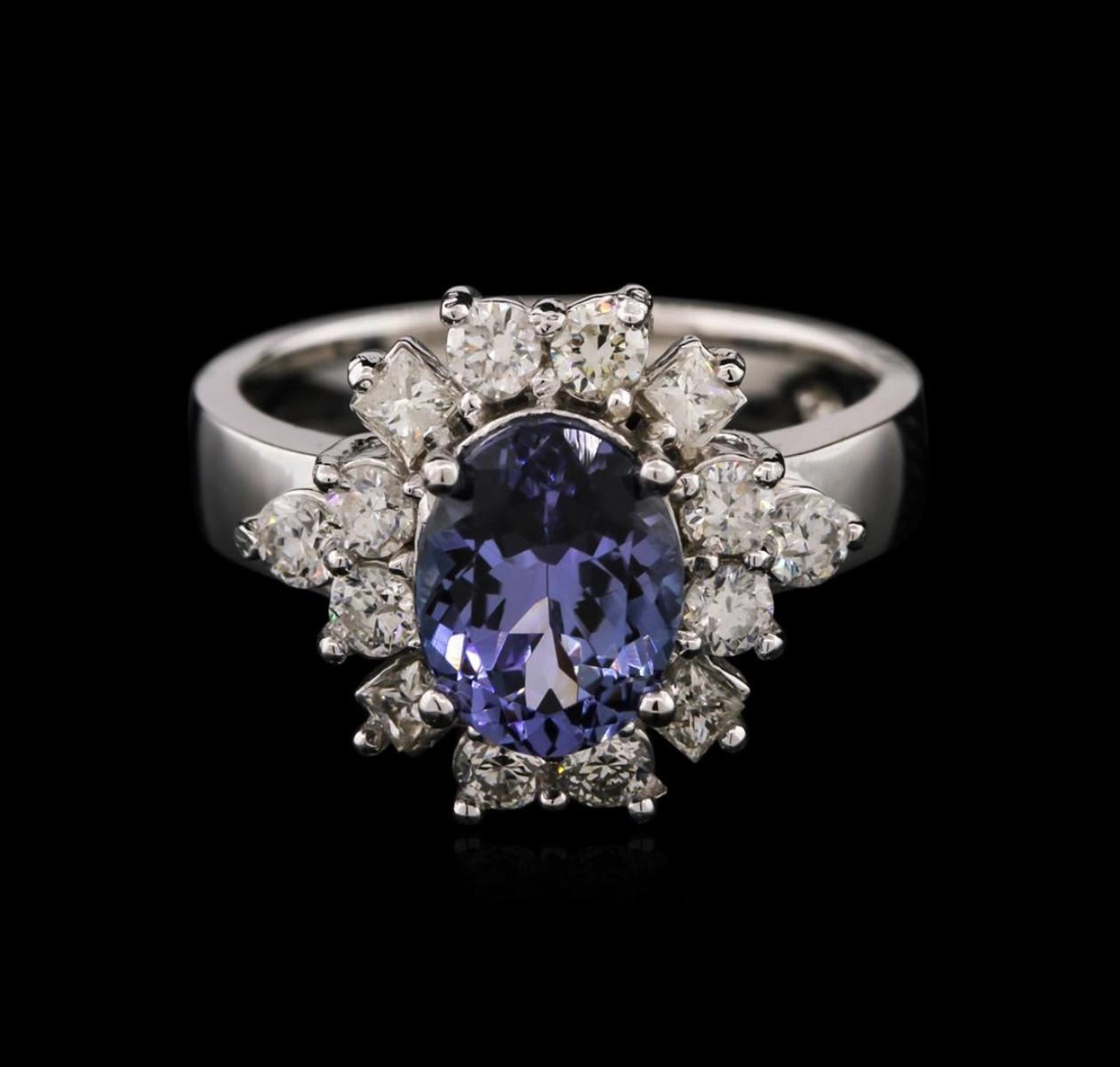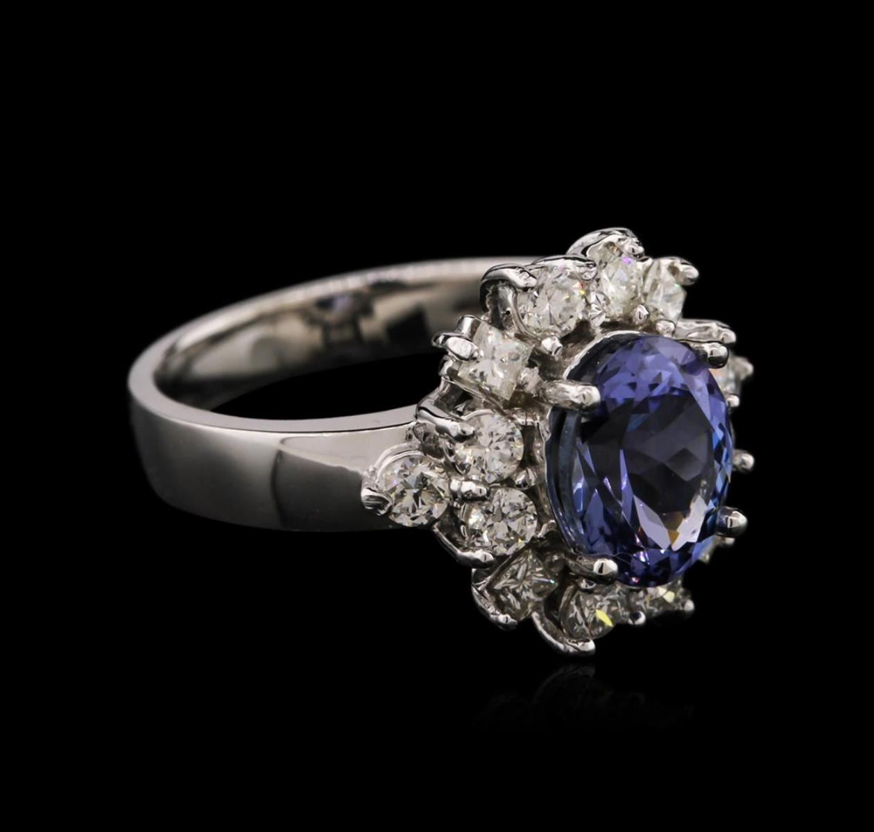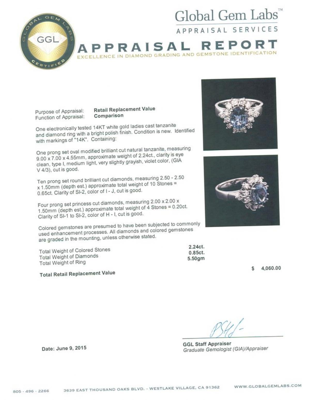 One electronically tested 14KT white gold ladies cast tanzanite and diamond ring with a bright polish finish. Identified with markings of "14K". Condition is new. Containing: One prong set oval modified brilliant cut natural tanzanite, measuring 9.00 x 7.00 x 4.55mm, approximate weight of 2.24ct., clarity is eye clean, type I, medium light, very slightly grayish, violet color, (GIA V 4/3), cut is good. Ten prong set round brilliant cut diamonds, measuring 2.50 - 2.50 x 1.50mm (depth est.) approximate total weight of 10 Stones = 0.65ct. Clarity: SI-2. Color: I - J, Cut is Good. Four prong set princess cut diamonds, measuring 2.00 x 2.00 x 1.50mm (depth est.) approximate total weight of 4 Stones = 0.20ct. Clarity: SI-1 to SI-2. Color: H - I, Cut is Good. Colored gemstones are presumed to have been subjected to commonly used enhancement processes. All diamonds and colored gemstones are graded in the mounting, unless otherwise stated. Total Weight of Colored Stones 2.24ct. Total Weight of Diamonds 0.85ct. Total Weight of Ring 5.50 grams. GGL Appraised.