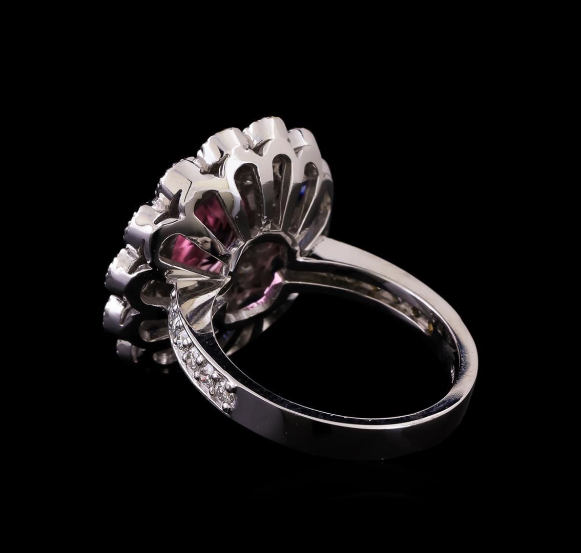 One electronically tested 14KT white gold ladies cast tourmaline, sapphire & diamond ring with a bright polish finish. Identified with markings of "K14". Condition is new. Containing: One prong set oval modified brilliant cut natural pink tourmaline, measuring 10.05 x 8.12 x 4.28mm, approximate weight of 2.24ct., clarity is eye clean, type II, light, slightly grayish, reddish purple color, (GIA rP 3/2), cut is good. Two prong set round modified brilliant cut natural blue sapphires, measuring 2.50 - 2.50 x 1.63 mm, approximate total weight of 0.16ct., clarity is eye clean, type II, medium, moderately strong, blue color, (GIA B 5/4), cut is good. Six gypsy set round brilliant cut diamonds, measuring 2.50 - 2.50 x 1.50mm (depth est.) approximate total weight of 6 Stones = 0.34ct. Clarity: SI-1. Color: J - K, Cut is Good. Fourteen gypsy set round brilliant cut diamonds, measuring 1.50 - 1.50 x 0.90mm (depth est.) approximate total weight of 14 Stones = 0.17ct. Clarity: SI-1. Color: J - K, Cut is Good. Colored gemstones are presumed to have been subjected to commonly used enhancement processes. All diamonds and colored gemstones are graded in the mounting, unless otherwise stated. Total Weight of Colored Stones 2.40ct. Total Weight of Diamonds 0.52ct. Total Weight of Ring 8.80 grams. GGL Appraised at $4,885.00.