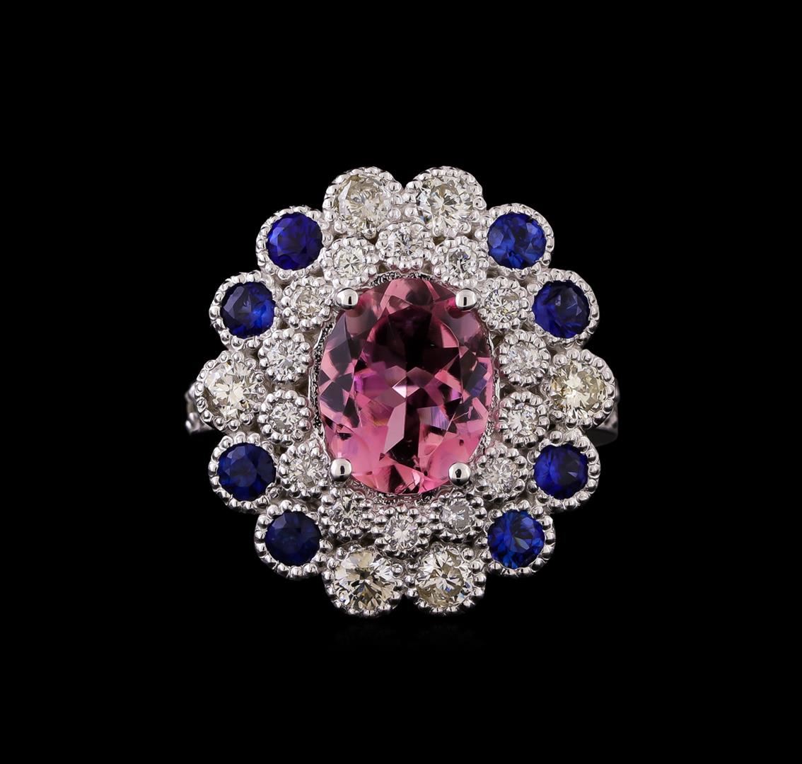 One electronically tested 14KT white gold ladies cast tourmaline, sapphire & diamond ring with a bright polish finish. Identified with markings of "K14". Condition is new. Containing: One prong set oval modified brilliant cut natural pink tourmaline, measuring 10.05 x 8.12 x 4.28mm, approximate weight of 2.24ct., clarity is eye clean, type II, light, slightly grayish, reddish purple color, (GIA rP 3/2), cut is good. Two prong set round modified brilliant cut natural blue sapphires, measuring 2.50 - 2.50 x 1.63 mm, approximate total weight of 0.16ct., clarity is eye clean, type II, medium, moderately strong, blue color, (GIA B 5/4), cut is good. Six gypsy set round brilliant cut diamonds, measuring 2.50 - 2.50 x 1.50mm (depth est.) approximate total weight of 6 Stones = 0.34ct. Clarity: SI-1. Color: J - K, Cut is Good. Fourteen gypsy set round brilliant cut diamonds, measuring 1.50 - 1.50 x 0.90mm (depth est.) approximate total weight of 14 Stones = 0.17ct. Clarity: SI-1. Color: J - K, Cut is Good. Colored gemstones are presumed to have been subjected to commonly used enhancement processes. All diamonds and colored gemstones are graded in the mounting, unless otherwise stated. Total Weight of Colored Stones 2.40ct. Total Weight of Diamonds 0.52ct. Total Weight of Ring 8.80 grams. GGL Appraised at $4,885.00.