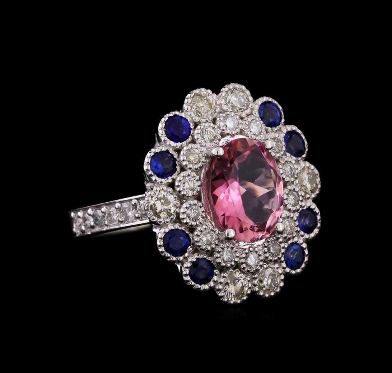 One electronically tested 14KT white gold ladies cast tourmaline, sapphire & diamond ring with a bright polish finish. Identified with markings of "K14". Condition is new. Containing: One prong set oval modified brilliant cut natural pink tourmaline, measuring 10.05 x 8.12 x 4.28mm, approximate weight of 2.24ct., clarity is eye clean, type II, light, slightly grayish, reddish purple color, (GIA rP 3/2), cut is good. Two prong set round modified brilliant cut natural blue sapphires, measuring 2.50 - 2.50 x 1.63 mm, approximate total weight of 0.16ct., clarity is eye clean, type II, medium, moderately strong, blue color, (GIA B 5/4), cut is good. Six gypsy set round brilliant cut diamonds, measuring 2.50 - 2.50 x 1.50mm (depth est.) approximate total weight of 6 Stones = 0.34ct. Clarity: SI-1. Color: J - K, Cut is Good. Fourteen gypsy set round brilliant cut diamonds, measuring 1.50 - 1.50 x 0.90mm (depth est.) approximate total weight of 14 Stones = 0.17ct. Clarity: SI-1. Color: J - K, Cut is Good. Colored gemstones are presumed to have been subjected to commonly used enhancement processes. All diamonds and colored gemstones are graded in the mounting, unless otherwise stated. Total Weight of Colored Stones 2.40 ct. Total Weight of Diamonds 0.52ct. Total Weight of Ring 8.80 grams. GGL Appraised.