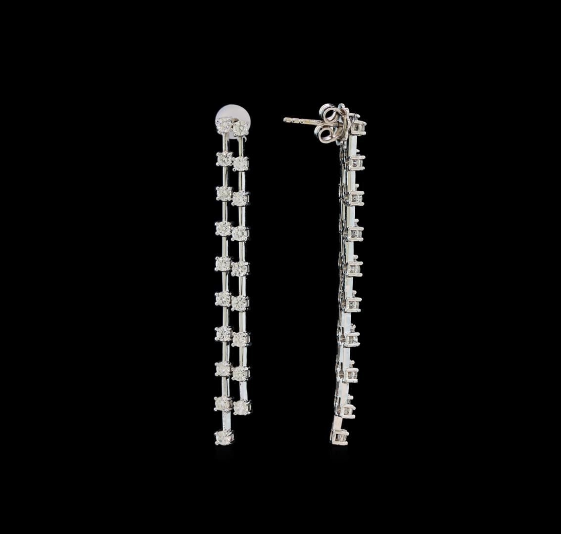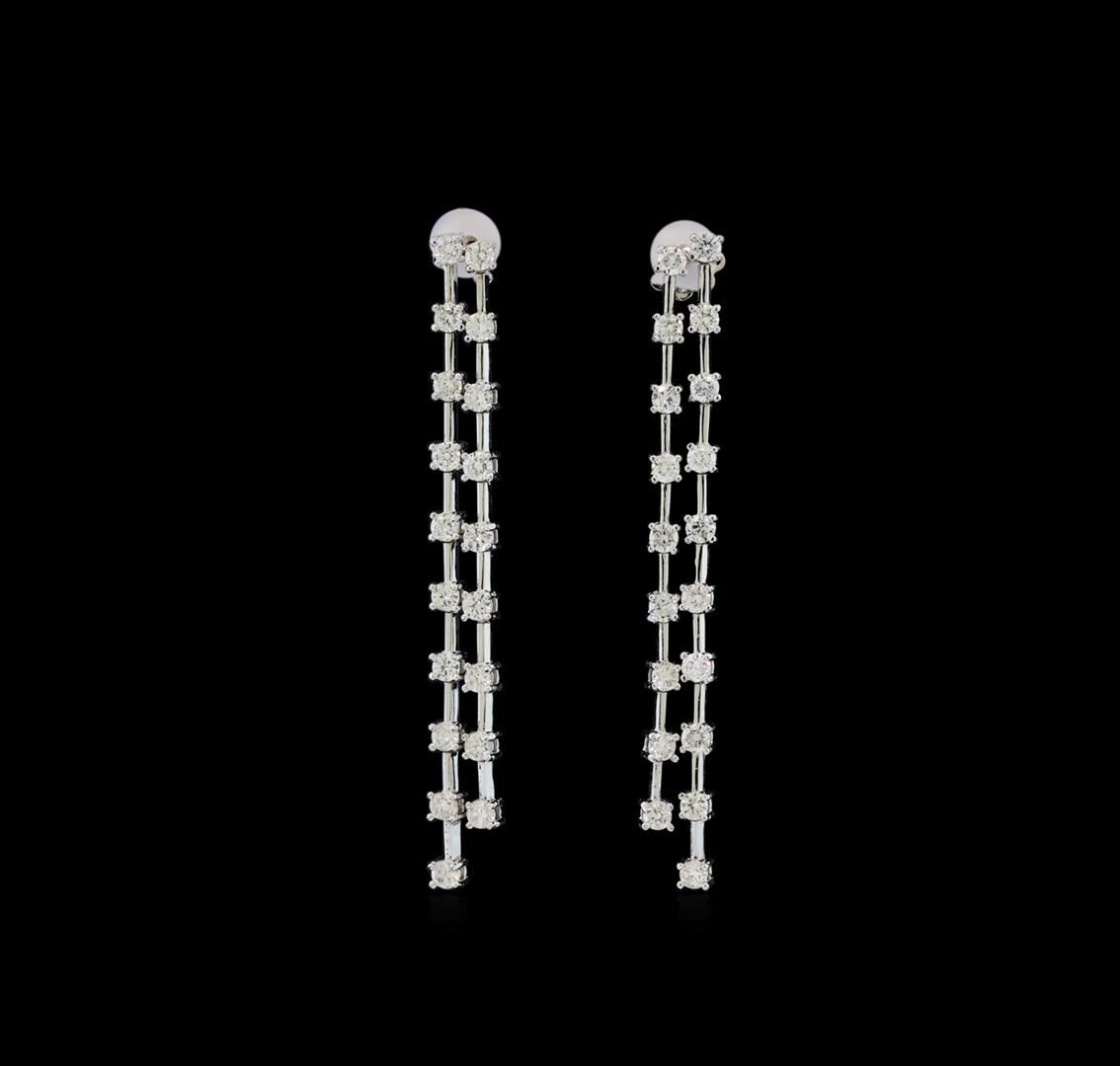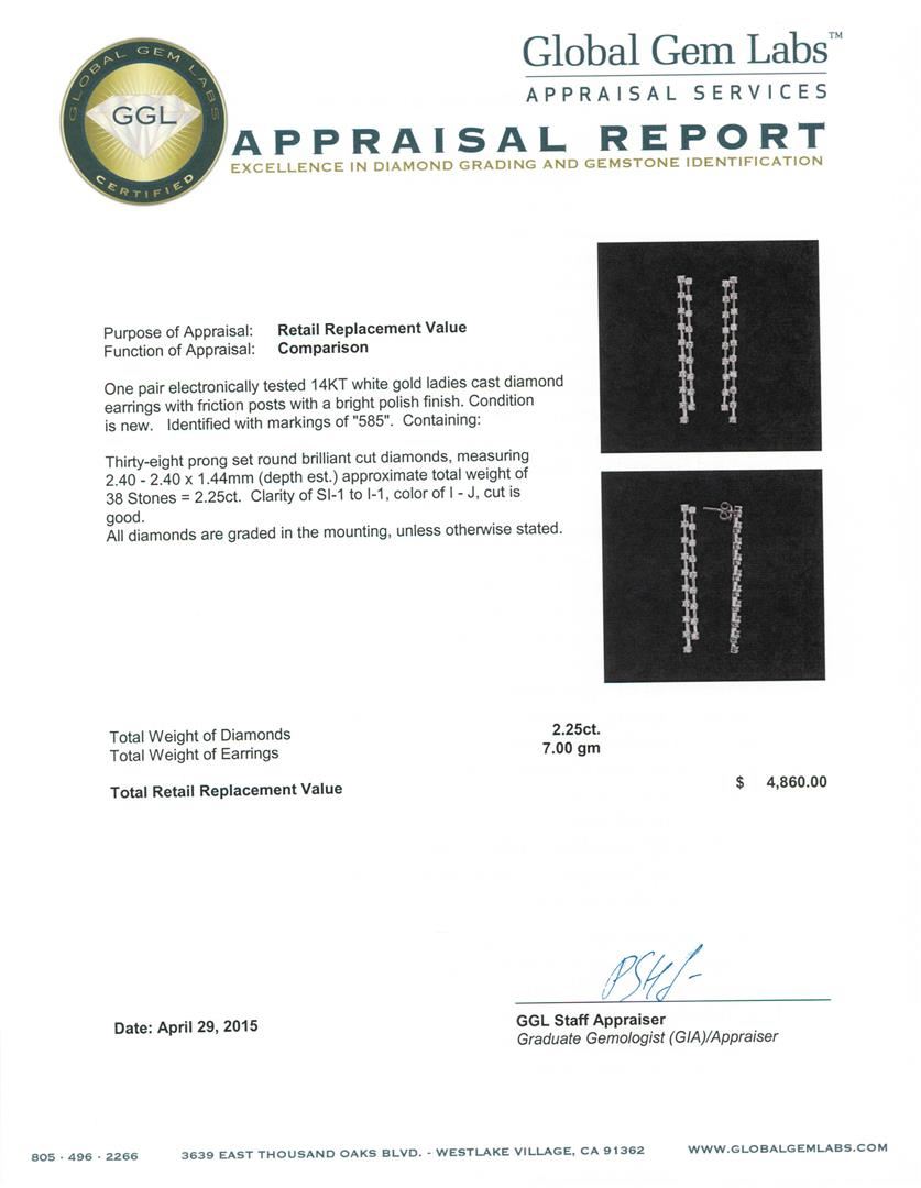 One pair electronically tested 14KT white gold ladies cast diamond earrings with friction posts with a bright polish finish. Identified with markings of "585". Condition is new. Containing: Thirty-Eight prong set round brilliant cut diamonds, measuring 2.40 - 2.40 x 1.44mm (depth est.) approximate total weight of 38 Stones = 2.25ct. Clarity: SI-1 to I-1. Color: I - J, Cut is Good. All diamonds are graded in the mounting, unless otherwise stated. Total Weight of Diamonds 2.25ct. Total Weight of Earrings 7.00 grams. GGL Appraised.