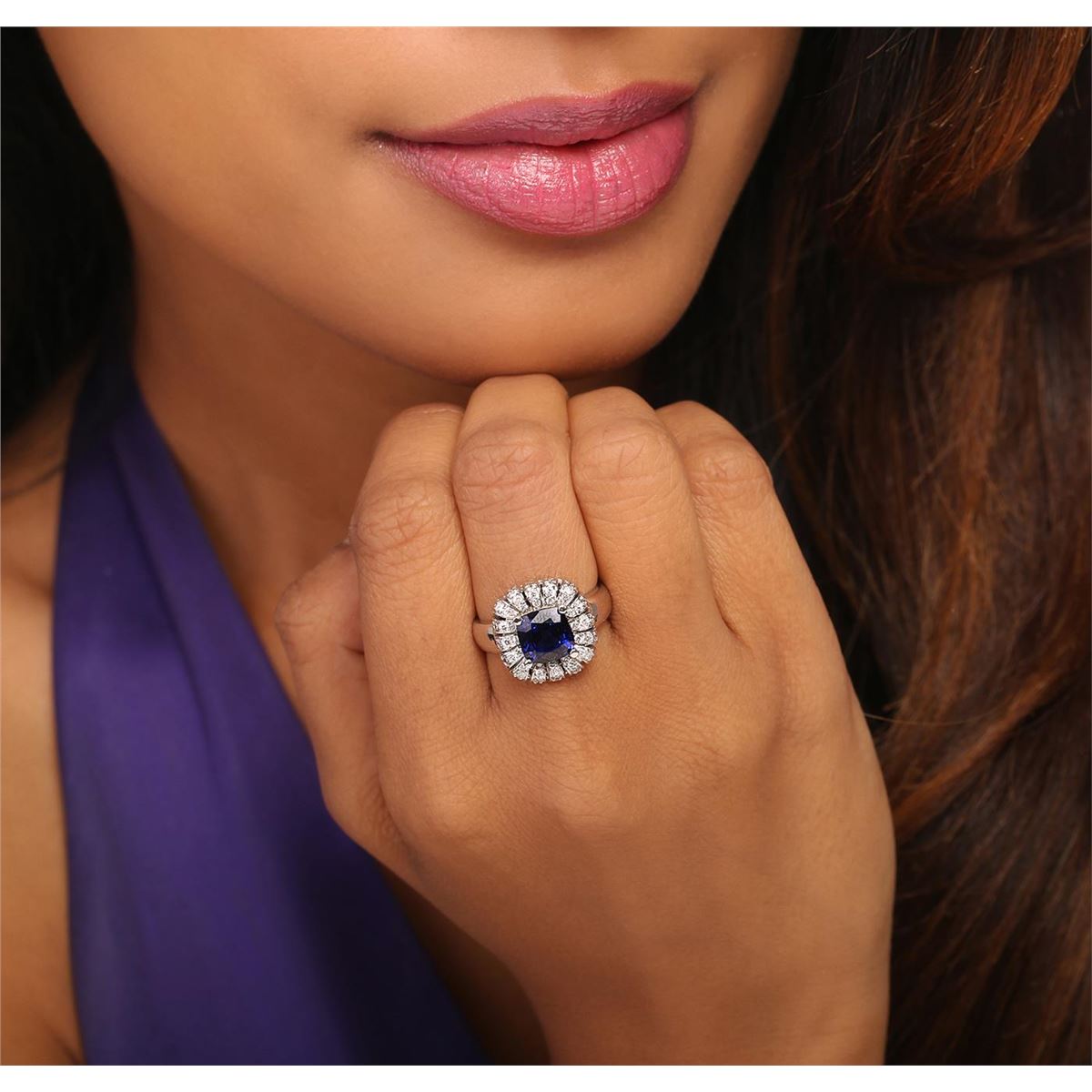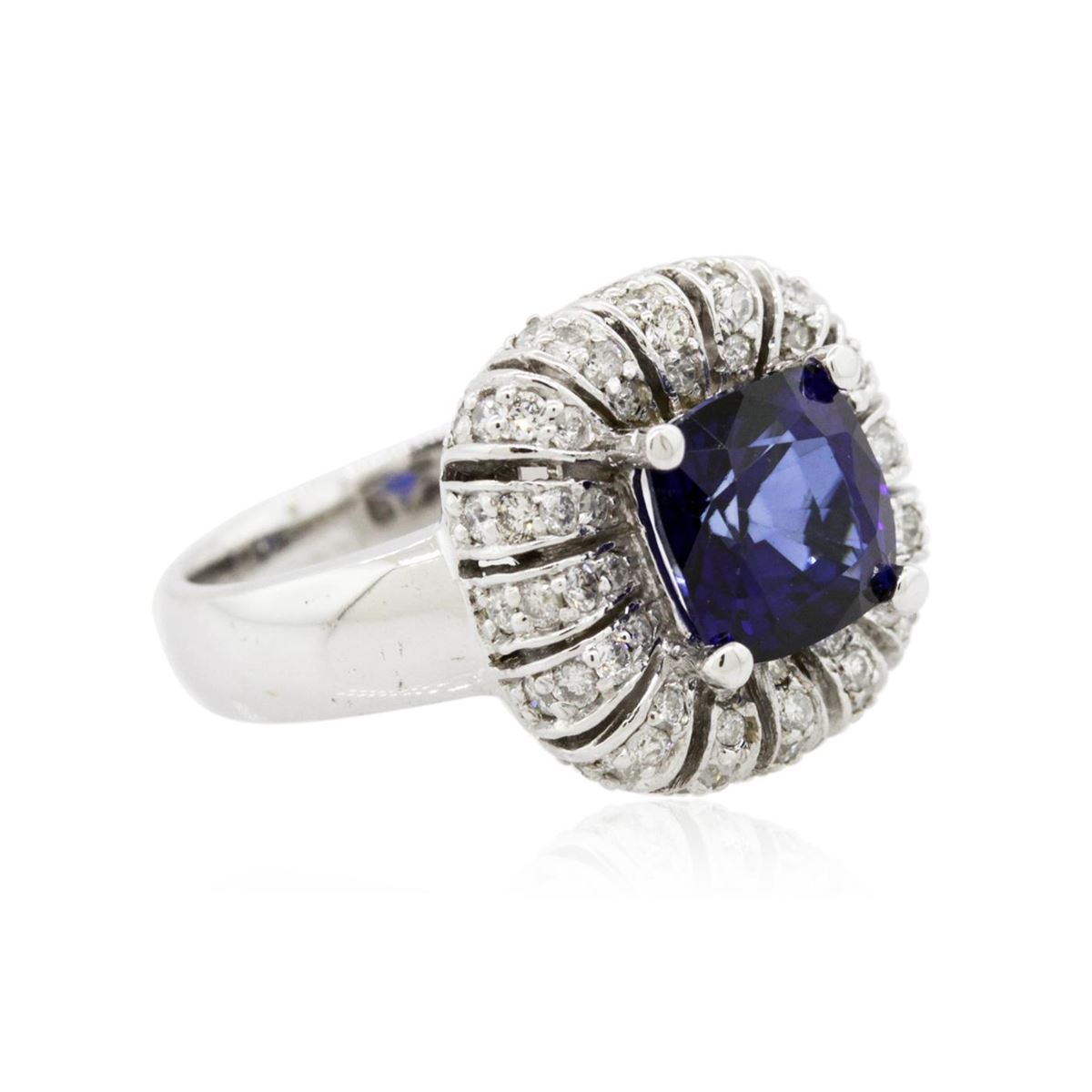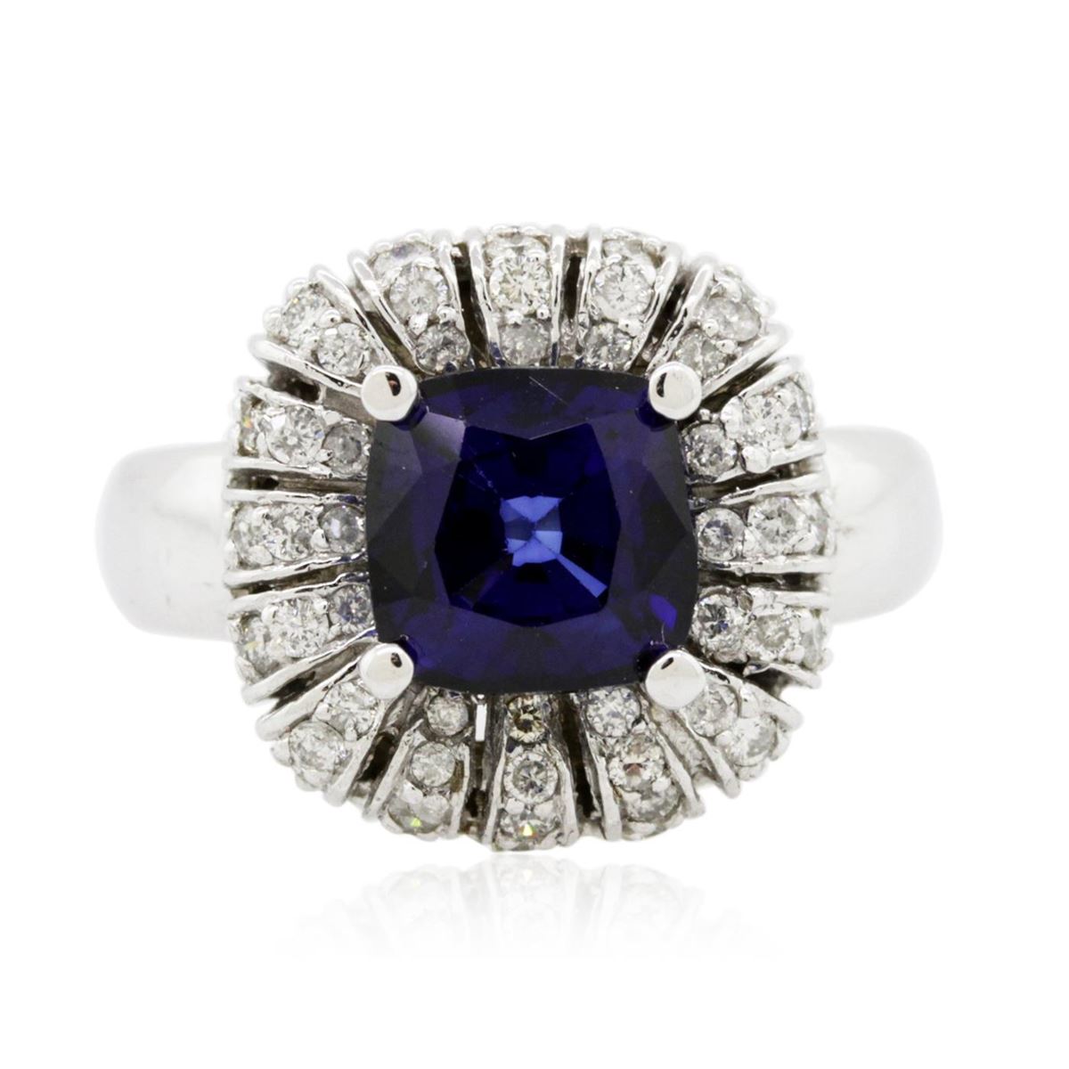 One electronically tested 14KT white gold ladies combination cast & assembled ring with a bright polish finish. Condition is new. Identified with markings of "14K". Containing: Sixty-Four prong set round brilliant cut diamonds, measuring 1.30 - 1.30 x 0.78mm (depth est.) approximate. Total Weight of 64 Stones = 0.51ct. Clarity: I-1 to I-2. Color: H - I, Cut is Good. One prong set square cushion modified brilliant cut natural tanzanite, measuring 7.60 x 7.60 x 4.94mm, approximate weight of 2.25ct., clarity is eye clean, type I, medium, moderately strong, blue color, (GIA B 5/4), cut is good. Colored gemstones are presumed to have been subjected to commonly used enhancement processes. All diamonds and colored gemstones are graded in the mounting, unless otherwise stated. Total Weight of Colored Stones 2.25ct. Total Weight of Diamonds 0.51ct. Total Weight of Ring 6.80 grams. GGL Appraised at $6,970.00.