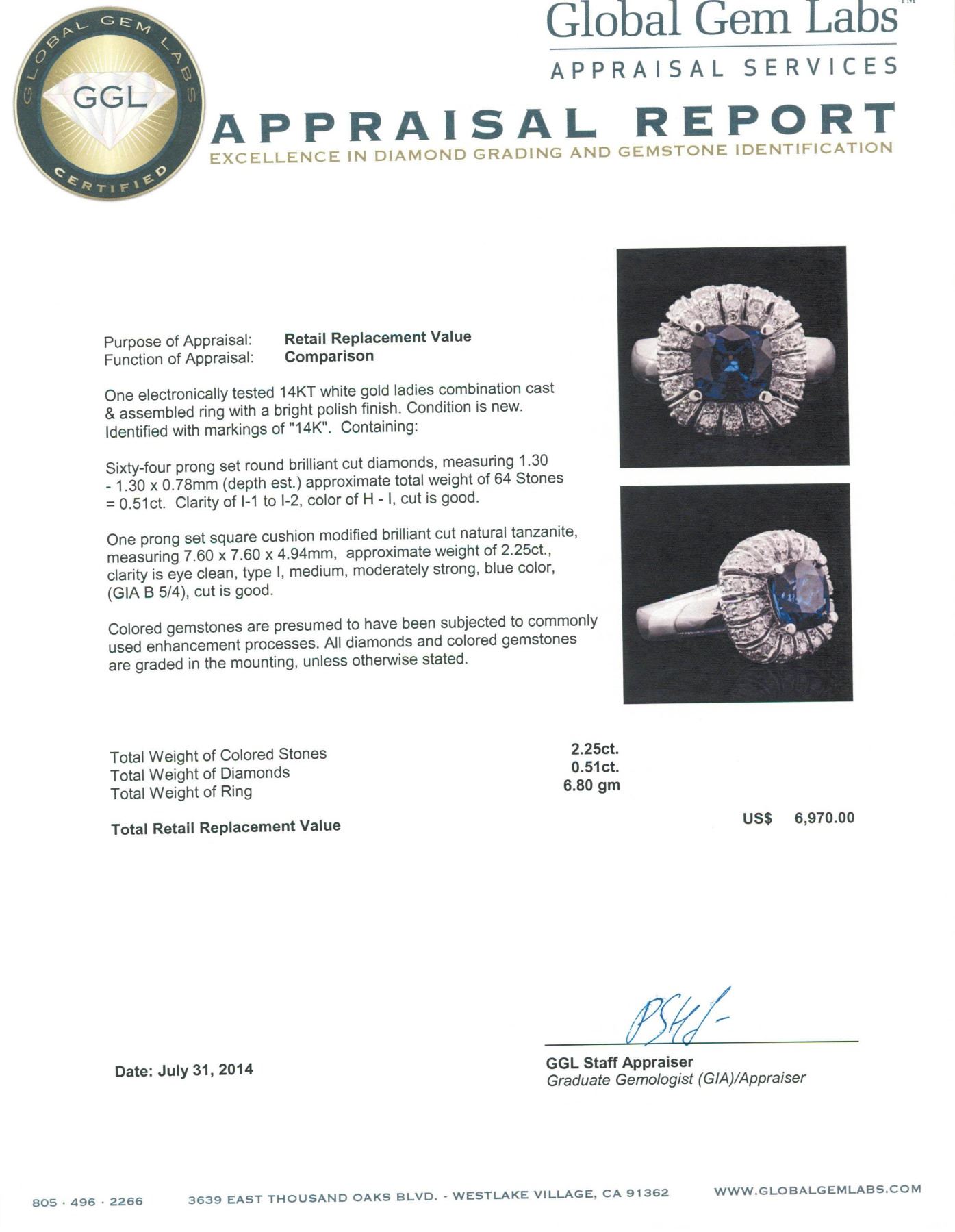 One electronically tested 14KT white gold ladies combination cast & assembled ring with a bright polish finish. Condition is new. Identified with markings of "14K". Containing: Sixty-Four prong set round brilliant cut diamonds, measuring 1.30 - 1.30 x 0.78mm (depth est.) approximate. Total Weight of 64 Stones = 0.51ct. Clarity: I-1 to I-2. Color: H - I, Cut is Good. One prong set square cushion modified brilliant cut natural tanzanite, measuring 7.60 x 7.60 x 4.94mm, approximate weight of 2.25ct., clarity is eye clean, type I, medium, moderately strong, blue color, (GIA B 5/4), cut is good. Colored gemstones are presumed to have been subjected to commonly used enhancement processes. All diamonds and colored gemstones are graded in the mounting, unless otherwise stated. Total Weight of Colored Stones 2.25ct. Total Weight of Diamonds 0.51ct. Total Weight of Ring 6.80 grams. GGL Appraised.