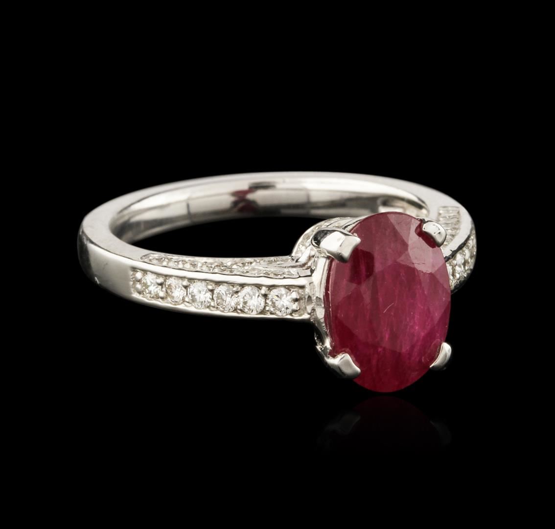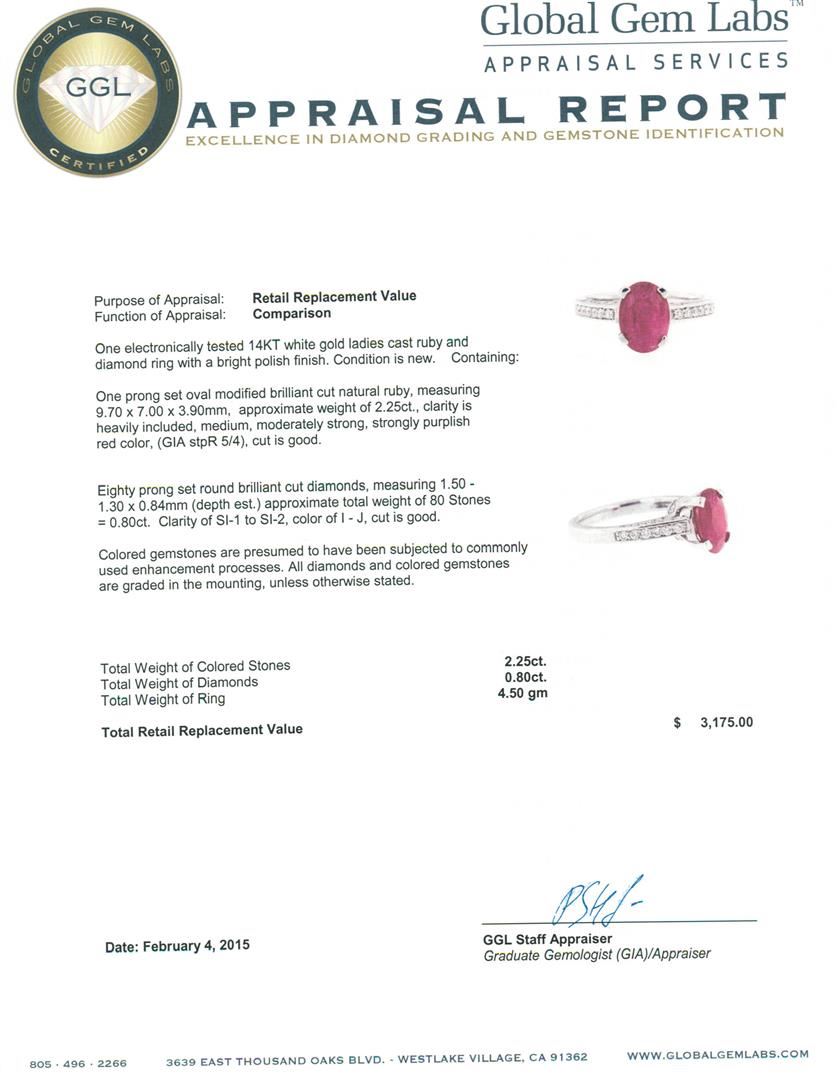 One electronically tested 14KT white gold ladies cast ruby and diamond ring with a bright polish finish. Condition is new. Containing: One prong set oval modified brilliant cut natural ruby, measuring 9.70 x 7.00 x 3.90mm, approximate weight of 2.25ct., clarity is heavily included, medium, moderately strong, strongly purplish red color, (GIA stpR 5/4), cut is good. Eighty prong set round brilliant cut diamonds, measuring 1.50 - 1.30 x 0.84mm (depth est.) approximate total weight of 80 Stones = 0.80ct. Clarity: SI-1 to SI-2. Color: I - J, Cut is Good. Colored gemstones are presumed to have been subjected to commonly used enhancement processes. All diamonds and colored gemstones are graded in the mounting, unless otherwise stated. Total Weight of Colored Stones 2.25ct. Total Weight of Diamonds 0.80ct. Total Weight of Ring 4.50 grams. GGL Appraised at $3,175.00.