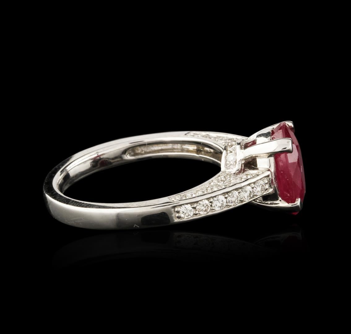 One electronically tested 14KT white gold ladies cast ruby and diamond ring with a bright polish finish. Condition is new. Containing: One prong set oval modified brilliant cut natural ruby, measuring 9.70 x 7.00 x 3.90mm, approximate weight of 2.25ct., clarity is heavily included, medium, moderately strong, strongly purplish red color, (GIA stpR 5/4), cut is good. Eighty prong set round brilliant cut diamonds, measuring 1.50 - 1.30 x 0.84mm (depth est.) approximate total weight of 80 Stones = 0.80ct. Clarity: SI-1 to SI-2. Color: I - J, Cut is Good. Colored gemstones are presumed to have been subjected to commonly used enhancement processes. All diamonds and colored gemstones are graded in the mounting, unless otherwise stated. Total Weight of Colored Stones 2.25ct. Total Weight of Diamonds 0.80ct. Total Weight of Ring 4.50 grams. GGL Appraised at $3,175.00.