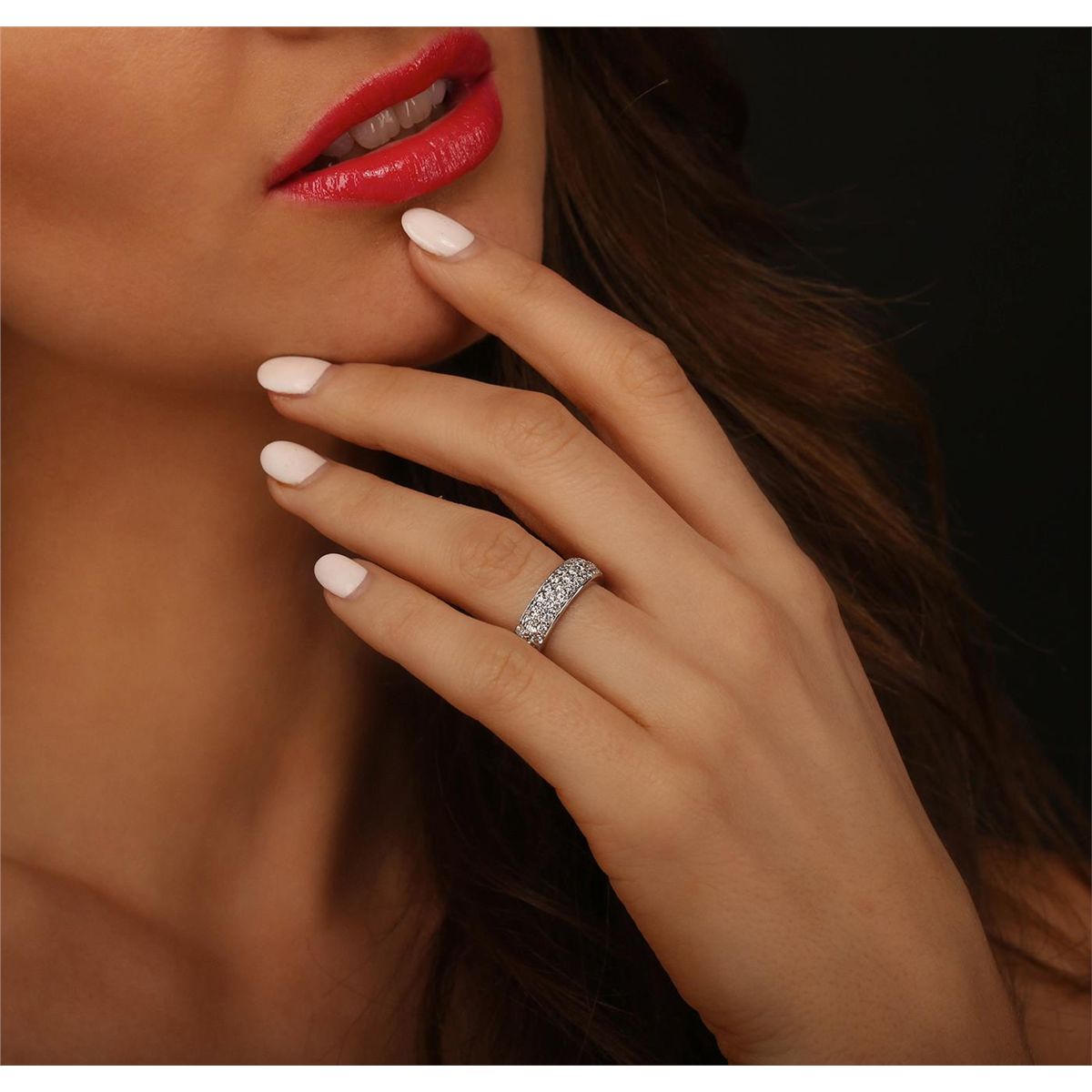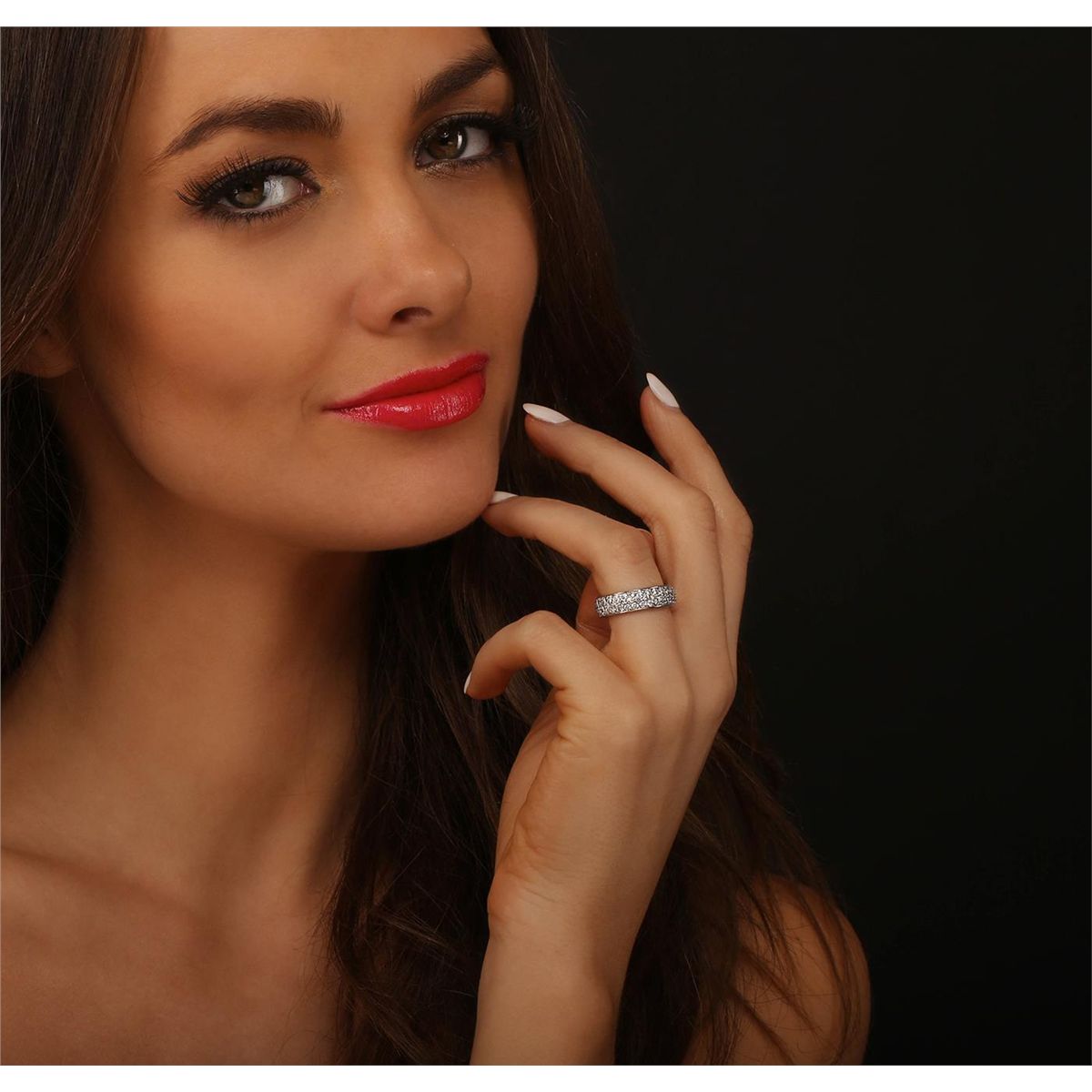 One electronically tested 14KT white gold ladies cast diamond eternity ring with a bright polish finish. Condition is new, good workmanship. The ring features a continuous four and one-half millimeter wide pave‚ set diamond ribbon. Containing: Ninety-Three pave‚ set round brilliant cut diamonds, measuring 1.90 - 1.80 x 1.11mm (depth est.) approximate. Total Weight of 93 Stones = 2.25ct. Graded in the setting. Clarity: SI-1 to I-1. Color: G - I. Total Weight of Diamonds 2.25ct. Total Weight of Ring 6.08 grams. AIG Appraised at $7,955.00.