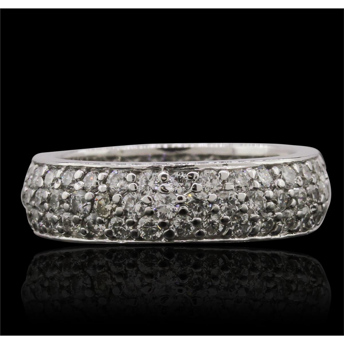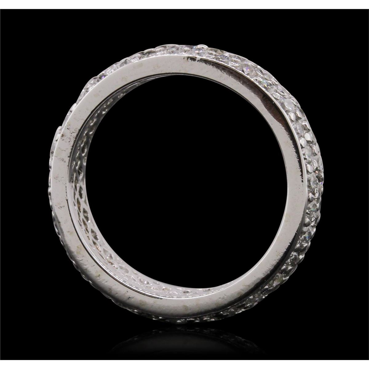 One electronically tested 14KT white gold ladies cast diamond eternity ring with a bright polish finish. Condition is new, good workmanship. The ring features a continuous four and one-half millimeter wide pave‚ set diamond ribbon. Containing: Ninety-Three pave‚ set round brilliant cut diamonds, measuring 1.90 - 1.80 x 1.11mm (depth est.) approximate. Total Weight of 93 Stones = 2.25ct. Graded in the setting. Clarity: SI-1 to I-1. Color: G - I. Total Weight of Diamonds 2.25ct. Total Weight of Ring 6.08 grams. AIG Appraised at $7,955.00.