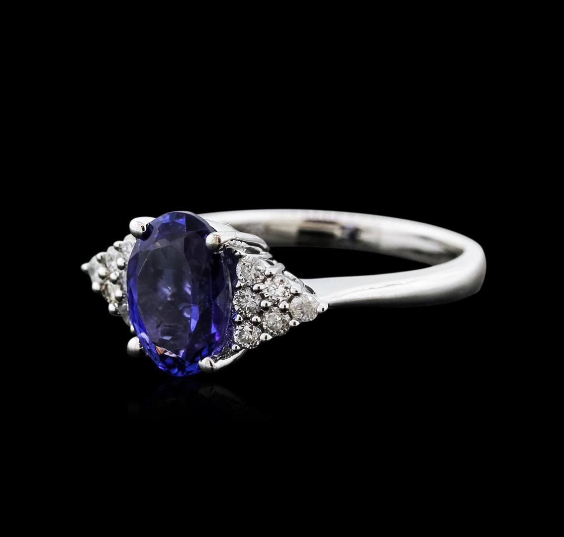 One electronically tested 14KT white gold ladies cast tanzanite and diamond ring with a cathedral shank with a bright polish finish. Trademark is Orianne. Identified with markings of "14K". Condition is new. Containing: One prong set oval modified brilliant cut natural tanzanite, measuring 9.91 x 6.91 x 4.70mm, approximate weight of 2.26ct., clarity is eye clean, type I, medium light, moderately strong, violet color, (GIA V 4/4), cut is good. Twelve prong set round brilliant cut diamonds, measuring 1.80 - 1.80 x 1.08mm (depth est.) approximate total weight of 12 Stones = 0.26ct. Clarity: SI-2 to I-2. Color: I - J. All diamonds and colored gemstones are graded in the mounting, unless otherwise stated. Colored gemstones are presumed to have been subjected to commonly used enhancement processes. Total Weight of Colored Stones 2.26ct. Total Weight of Diamonds 0.26ct. Total Weight of Ring 4.80 grams. GGL Appraised at $3,230.00.
