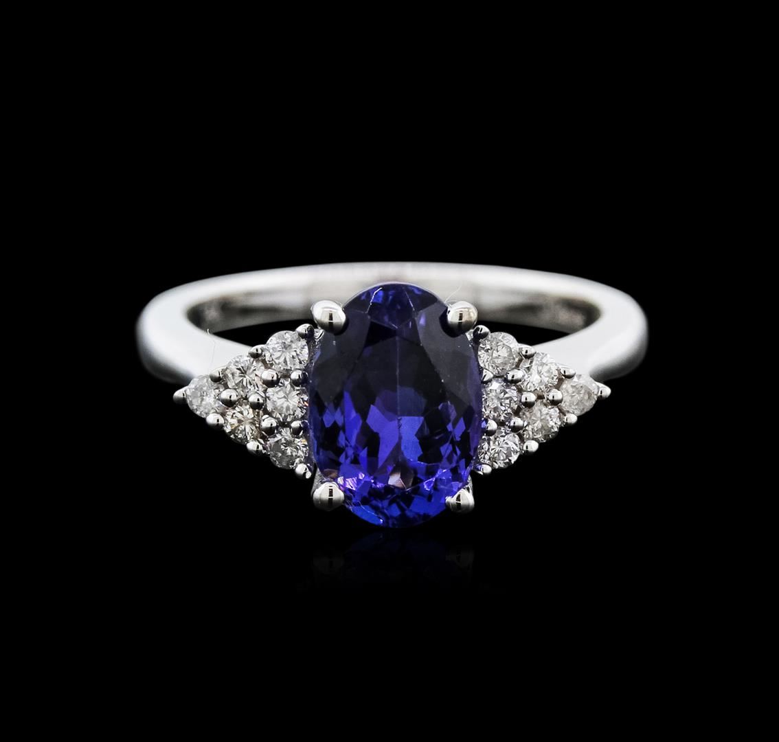 One electronically tested 14KT white gold ladies cast tanzanite and diamond ring with a cathedral shank with a bright polish finish. Trademark is Orianne. Identified with markings of "14K". Condition is new. Containing: One prong set oval modified brilliant cut natural tanzanite, measuring 9.91 x 6.91 x 4.70mm, approximate weight of 2.26ct., clarity is eye clean, type I, medium light, moderately strong, violet color, (GIA V 4/4), cut is good. Twelve prong set round brilliant cut diamonds, measuring 1.80 - 1.80 x 1.08mm (depth est.) approximate total weight of 12 Stones = 0.26ct. Clarity: SI-2 to I-2. Color: I - J. All diamonds and colored gemstones are graded in the mounting, unless otherwise stated. Colored gemstones are presumed to have been subjected to commonly used enhancement processes. Total Weight of Colored Stones 2.26ct. Total Weight of Diamonds 0.26ct. Total Weight of Ring 4.80 grams. GGL Appraised at $3,230.00.