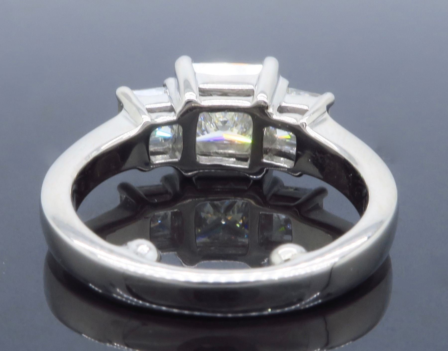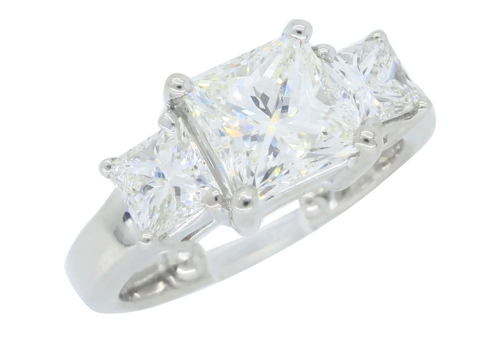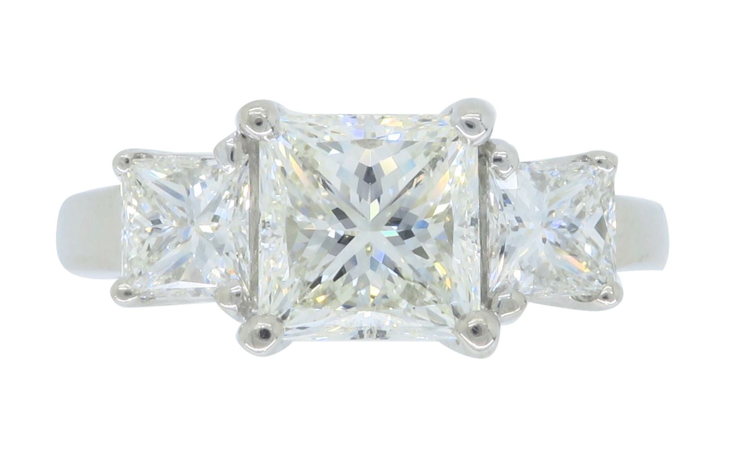 One 14KT White Gold 2.26ctw Diamond Ring. (1) Princess cut Diamond with a total weight of 1.52cts with a color of J and clarity of VS-1. (2) Princess cut Diamonds with a total weight of 0.74cts. Total weight of this ring is 5.7 grams. Ring size is 4.