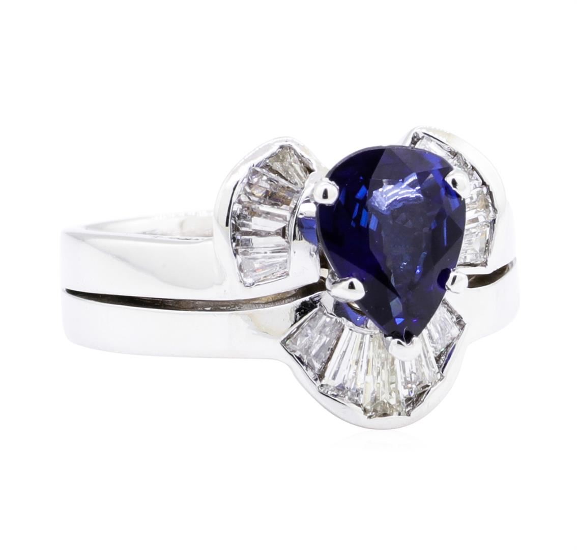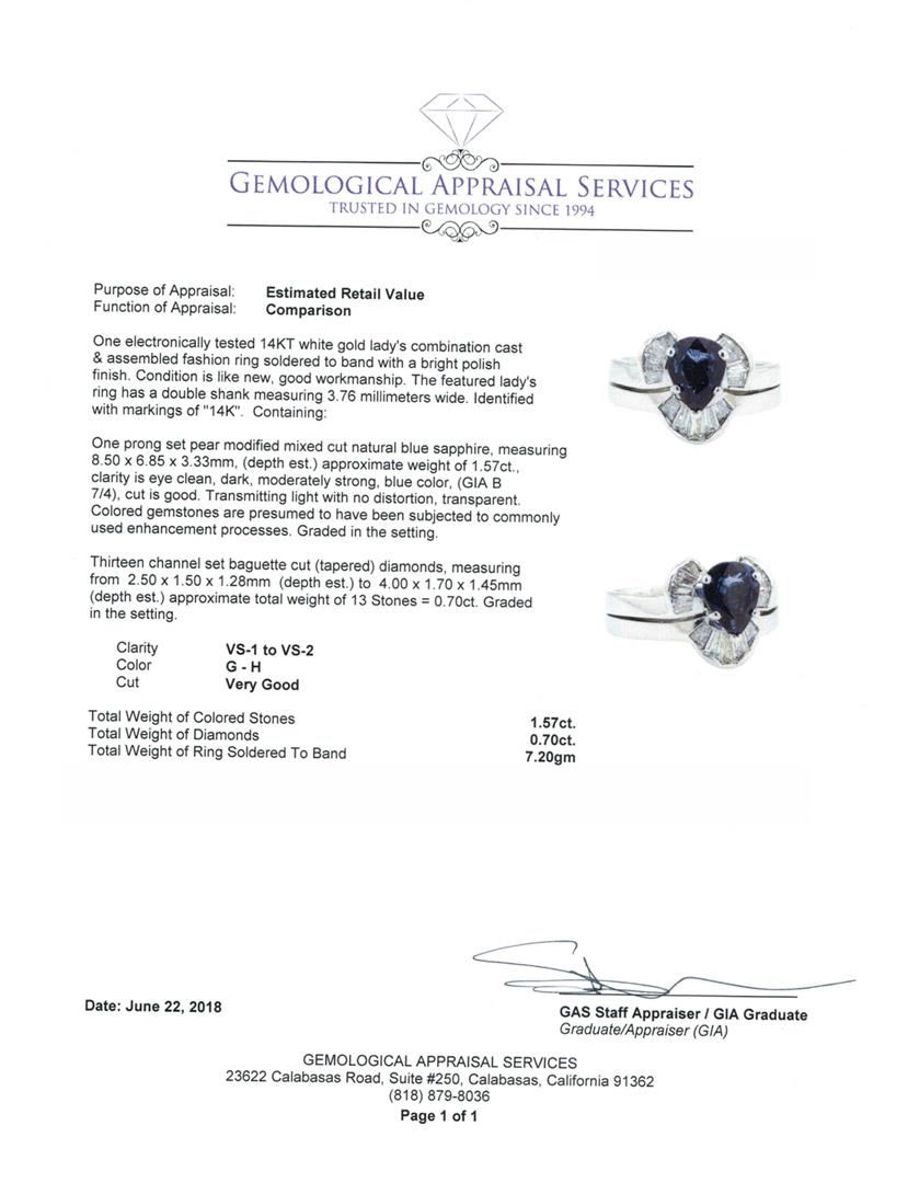 One electronically tested 14KT white gold lady's combination cast & assembled fashion ring soldered to band with a bright polish finish. The featured lady's ring has a double shank measuring 3.76 millimeters wide. Identified with markings of '14K'. Condition is like new, good workmanship. Containing: One prong set pear modified mixed cut natural blue sapphire, measuring 8.50 x 6.85 x 3.33mm, (depth est.) approximate weight of 1.57ct., clarity is eye clean, dark, moderately strong, blue color, (GIA B 7/4), cut is good. Transmitting light with no distortion, transparent. Colored gemstones are presumed to have been subjected to commonly used enhancement processes. Graded in the setting. Thirteen channel set baguette cut (tapered) diamonds, measuring from 2.50 x 1.50 x 1.28mm (depth est.) to 4.00 x 1.70 x 1.45mm (depth est.) approximate total weight of 13 Stones = 0.70ct. Graded in the setting. Color G - H Clarity VS-1 to VS-2 Cut Very Good. Total Weight of Colored Stones 1.57ct. Total Weight of Diamonds 0.70ct. Total Weight of Ring Soldered To Band 7.20gm. GAS Appraised.