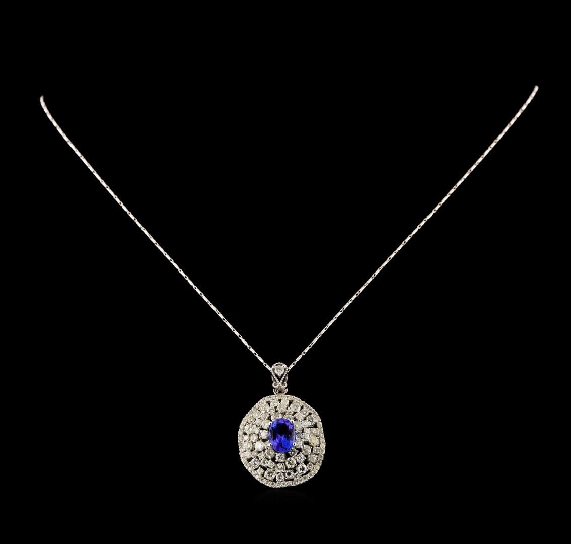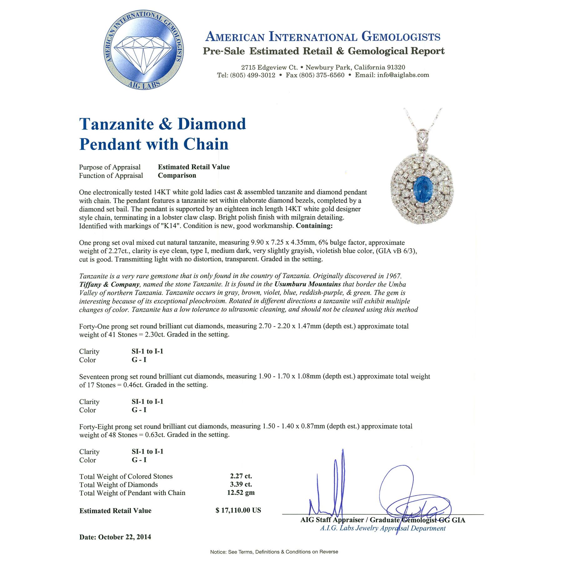 One prong set oval mixed cut natural tanzanite, measuring 9.90 x 7.25 x 4.35mm, 6% bulge factor, approximate weight of 2.27ct., clarity is eye clean, type I, medium dark, very slightly grayish, violetish blue color, (GIA vB 6/3), cut is good. Transmitting light with no distortion, transparent. Graded in the setting. Tanzanite is a very rare gemstone that is only found in the country of Tanzania. Originally discovered in 1967. Tiffany & Company, named the stone Tanzanite. The gem is interesting because of its exceptional pleochroism. Rotated in different directions a tanzanite will exhibit multiple changes of color. Tanzanite has a low tolerance to ultrasonic cleaning, and should not be cleaned using this method. Forty-One prong set round brilliant cut diamonds, measuring 2.70 - 2.20 x 1.47mm (depth est.) approximate total weight of 41 Stones = 2.30ct. Graded in the setting. Clarity: SI-1 to I-1. Color: G - I Seventeen prong set round brilliant cut diamonds, measuring 1.90 - 1.70 x 1.08mm (depth est.) approximate total weight of 17 Stones = 0.46ct. Graded in the setting. Clarity: SI-1 to I-1. Color: G - I Forty-Eight prong set round brilliant cut diamonds, measuring 1.50 - 1.40 x 0.87mm (depth est.) approximate total weight of 48 Stones = 0.63ct. Graded in the setting. Clarity: SI-1 to I-1. Color: G - I. Total Weight of Colored Stones 2.27ct. Total Weight of Diamonds 3.39ct. Total Weight of Pendant With Chain 12.52 grams. AIG Appraised.