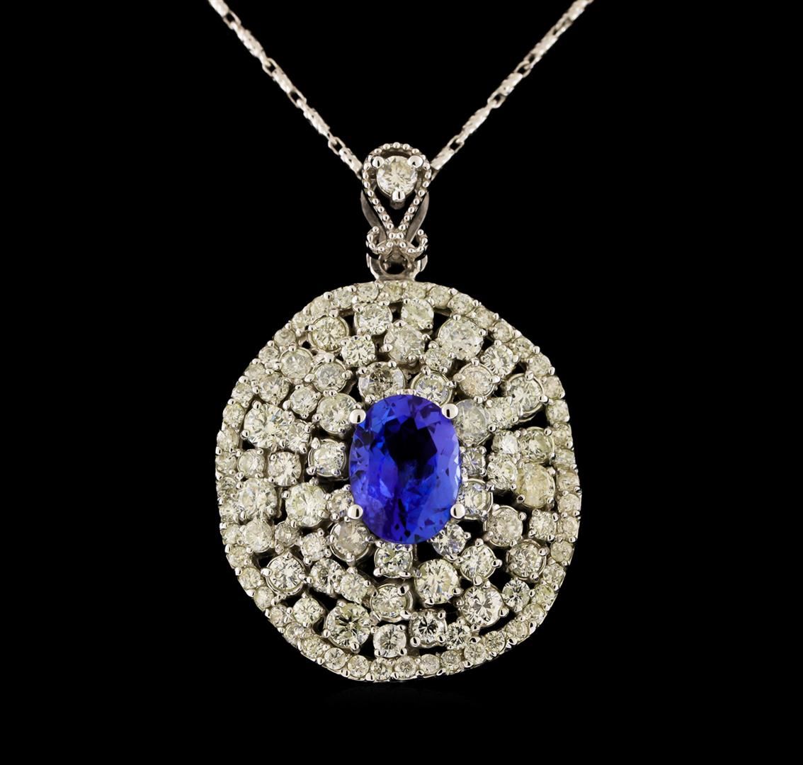One prong set oval mixed cut natural tanzanite, measuring 9.90 x 7.25 x 4.35mm, 6% bulge factor, approximate weight of 2.27ct., clarity is eye clean, type I, medium dark, very slightly grayish, violetish blue color, (GIA vB 6/3), cut is good. Transmitting light with no distortion, transparent. Graded in the setting. Tanzanite is a very rare gemstone that is only found in the country of Tanzania. Originally discovered in 1967. Tiffany & Company, named the stone Tanzanite. The gem is interesting because of its exceptional pleochroism. Rotated in different directions a tanzanite will exhibit multiple changes of color. Tanzanite has a low tolerance to ultrasonic cleaning, and should not be cleaned using this method. Forty-One prong set round brilliant cut diamonds, measuring 2.70 - 2.20 x 1.47mm (depth est.) approximate total weight of 41 Stones = 2.30ct. Graded in the setting. Clarity: SI-1 to I-1. Color: G - I Seventeen prong set round brilliant cut diamonds, measuring 1.90 - 1.70 x 1.08mm (depth est.) approximate total weight of 17 Stones = 0.46ct. Graded in the setting. Clarity: SI-1 to I-1. Color: G - I Forty-Eight prong set round brilliant cut diamonds, measuring 1.50 - 1.40 x 0.87mm (depth est.) approximate total weight of 48 Stones = 0.63ct. Graded in the setting. Clarity: SI-1 to I-1. Color: G - I. Total Weight of Colored Stones 2.27ct. Total Weight of Diamonds 3.39ct. Total Weight of Pendant With Chain 12.52 grams. AIG Appraised.