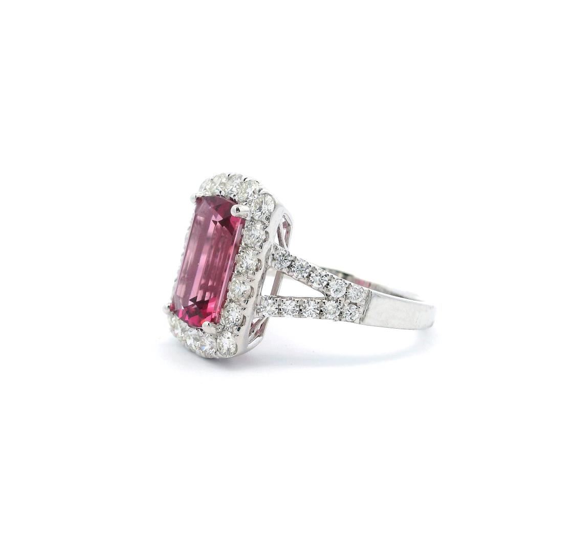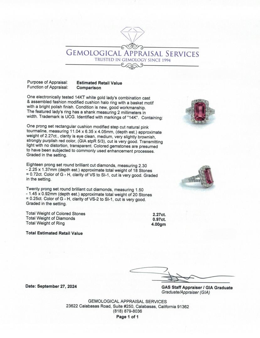 One electronically tested 14KT white gold lady's combination cast & assembled fashion modified cushion halo ring with a basket motif with a bright polish finish. The featured lady's ring has a shank measuring 2 millimeters in width. Trademark is UCG. Identified with markings of "14K". Condition is new, good workmanship.Containing: One prong set rectangular cushion modified step cut natural pink tourmaline, measuring 11.04 x 6.35 x 4.05mm, (depth est.) approximate weight of 2.27ct., clarity is eye clean, medium, very slightly brownish, strongly purplish red color, (GIA stpR 5/3), cut is very good. Transmitting light with no distortion, transparent. Colored gemstones are presumed to have been subjected to commonly used enhancement processes. Graded in the setting. Eighteen prong set round brilliant cut diamonds, measuring 2.30 - 2.25 x 1.37mm (depth est.) approximate total weight of 18 Stones = 0.72ct. Graded in the setting. Color: G - H. Clarity: VS to SI-1. Cut: Very Good. Twenty prong set round brilliant cut diamonds, measuring 1.50 - 1.45 x 0.92mm (depth est.) approximate total weight of 20 Stones = 0.25ct. Graded in the setting. Color: G - H. Clarity: VS-2 to SI-1. Cut: Very Good. Total Weight of Colored Stones: 2.27ct. Total Weight of Diamonds: 0.97ct. Total Weight of Ring: 4.00gm. Appraised by Gemological Appraisal Services. GAS Appraised.