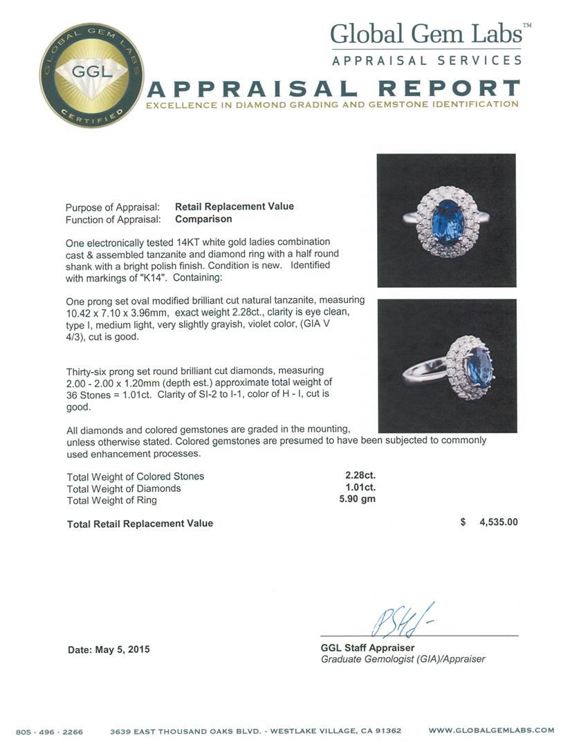 One electronically tested 14KT white gold ladies combination cast & assembled tanzanite and diamond ring with a half round shank with a bright polish finish. Identified with markings of "K14". Condition is new. Containing: One prong set oval modified brilliant cut natural tanzanite, measuring 10.42 x 7.10 x 3.96mm, exact weight 2.28ct., clarity is eye clean, type I, medium light, very slightly grayish, violet color, (GIA V 4/3), cut is good. Thirty-Six prong set round brilliant cut diamonds, measuring 2.00 - 2.00 x 1.20mm (depth est.) approximate total weight of 36 Stones = 1.01ct. Clarity: SI-2 to I-1. Color: H - I, Cut is Good. All diamonds and colored gemstones are graded in the mounting, unless otherwise stated. Colored gemstones are presumed to have been subjected to commonly used enhancement processes.. Total Weight of Colored Stones 2.28ct. Total Weight of Diamonds 1.01ct. Total Weight of Ring 5.90 grams. GGL Appraised at $4,535.00.
