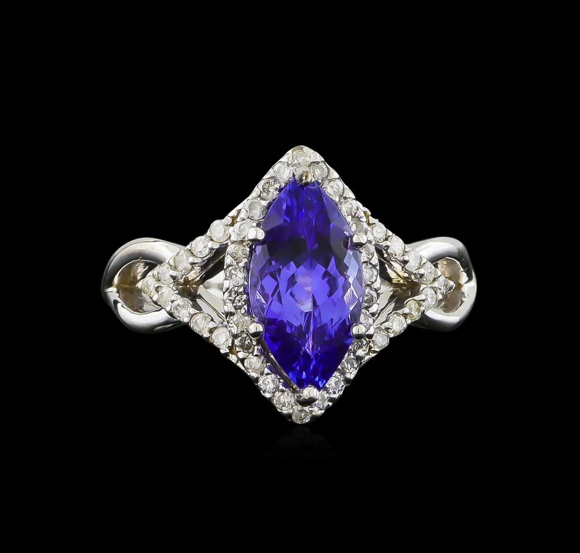 One electronically tested 14KT white gold ladies combination cast & assembled engagement ring with a bright polish finish. Identified with markings of "K14". Condition is new. Containing: One prong set marquise modified brilliant cut natural tanzanite, measuring 13.00 x 6.50 x 4.23mm, approximate weight of 2.28ct., clarity is eye clean, type I, medium, moderately strong, bluish violet color, (GIA bV 5/4), cut is good. Thirty prong set round brilliant cut diamonds, measuring 1.20 - 1.20 x 0.72mm (depth est.) approximate total weight of 30 Stones = 0.19ct. Clarity: I-1 to I-2. Color: I - J, Cut is Good. Colored gemstones are presumed to have been subjected to commonly used enhancement processes. All diamonds and colored gemstones are graded in the mounting, unless otherwise stated. Total Weight of Colored Stones 2.28ct. Total Weight of Diamonds 0.19ct. Total Weight of Ring 5.60 grams. GGL Appraised at $6,325.00.