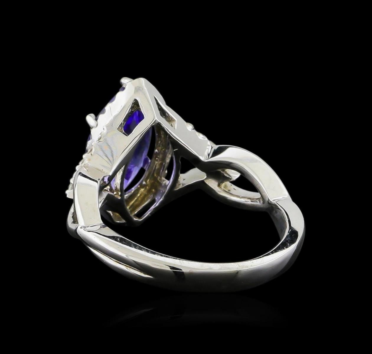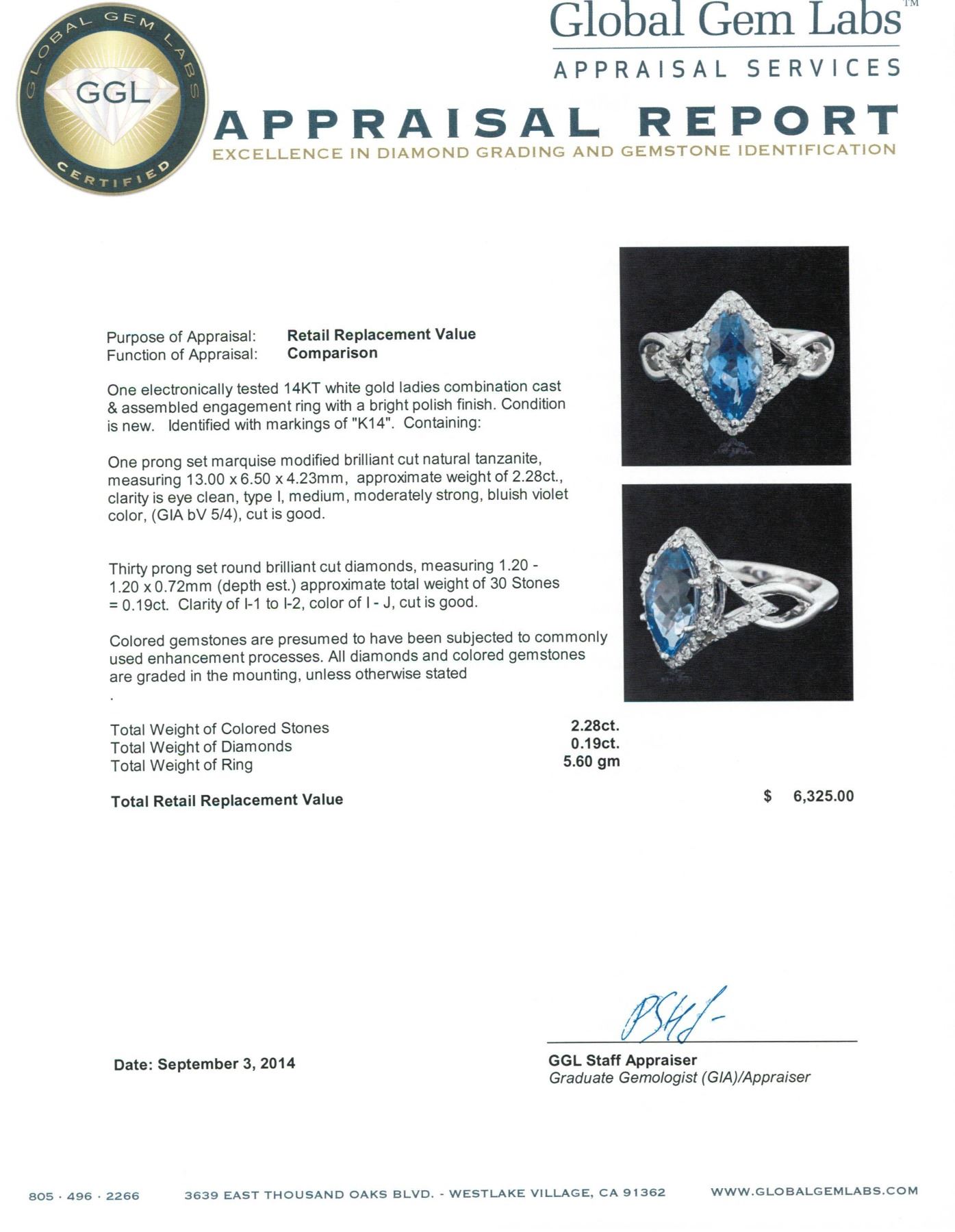 One electronically tested 14KT white gold ladies combination cast & assembled engagement ring with a bright polish finish. Identified with markings of "K14". Condition is new. Containing: One prong set marquise modified brilliant cut natural tanzanite, measuring 13.00 x 6.50 x 4.23mm, approximate weight of 2.28ct., clarity is eye clean, type I, medium, moderately strong, bluish violet color, (GIA bV 5/4), cut is good. Thirty prong set round brilliant cut diamonds, measuring 1.20 - 1.20 x 0.72mm (depth est.) approximate total weight of 30 Stones = 0.19ct. Clarity: I-1 to I-2. Color: I - J, Cut is Good. Colored gemstones are presumed to have been subjected to commonly used enhancement processes. All diamonds and colored gemstones are graded in the mounting, unless otherwise stated. Total Weight of Colored Stones 2.28ct. Total Weight of Diamonds 0.19ct. Total Weight of Ring 5.60 grams. GGL Appraised.