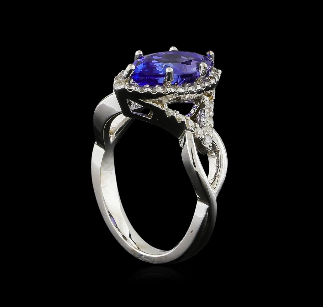 One electronically tested 14KT white gold ladies combination cast & assembled engagement ring with a bright polish finish. Identified with markings of "K14". Condition is new. Containing: One prong set marquise modified brilliant cut natural tanzanite, measuring 13.00 x 6.50 x 4.23mm, approximate weight of 2.28ct., clarity is eye clean, type I, medium, moderately strong, bluish violet color, (GIA bV 5/4), cut is good. Thirty prong set round brilliant cut diamonds, measuring 1.20 - 1.20 x 0.72mm (depth est.) approximate total weight of 30 Stones = 0.19ct. Clarity: I-1 to I-2. Color: I - J, Cut is Good. Colored gemstones are presumed to have been subjected to commonly used enhancement processes. All diamonds and colored gemstones are graded in the mounting, unless otherwise stated. Total Weight of Colored Stones 2.28ct. Total Weight of Diamonds 0.19ct. Total Weight of Ring 5.60 grams. GGL Appraised.