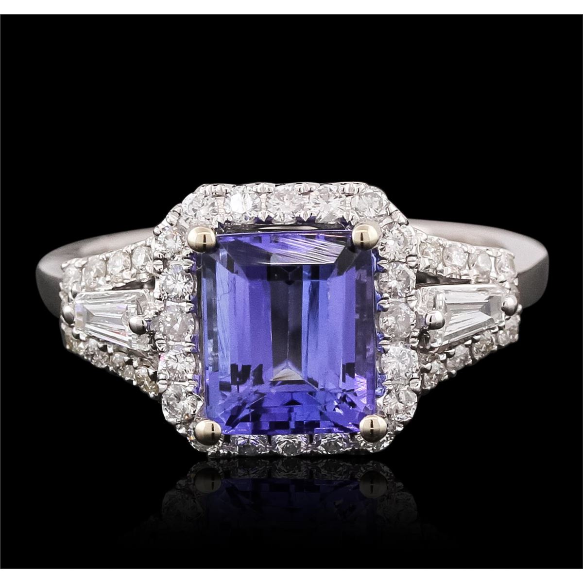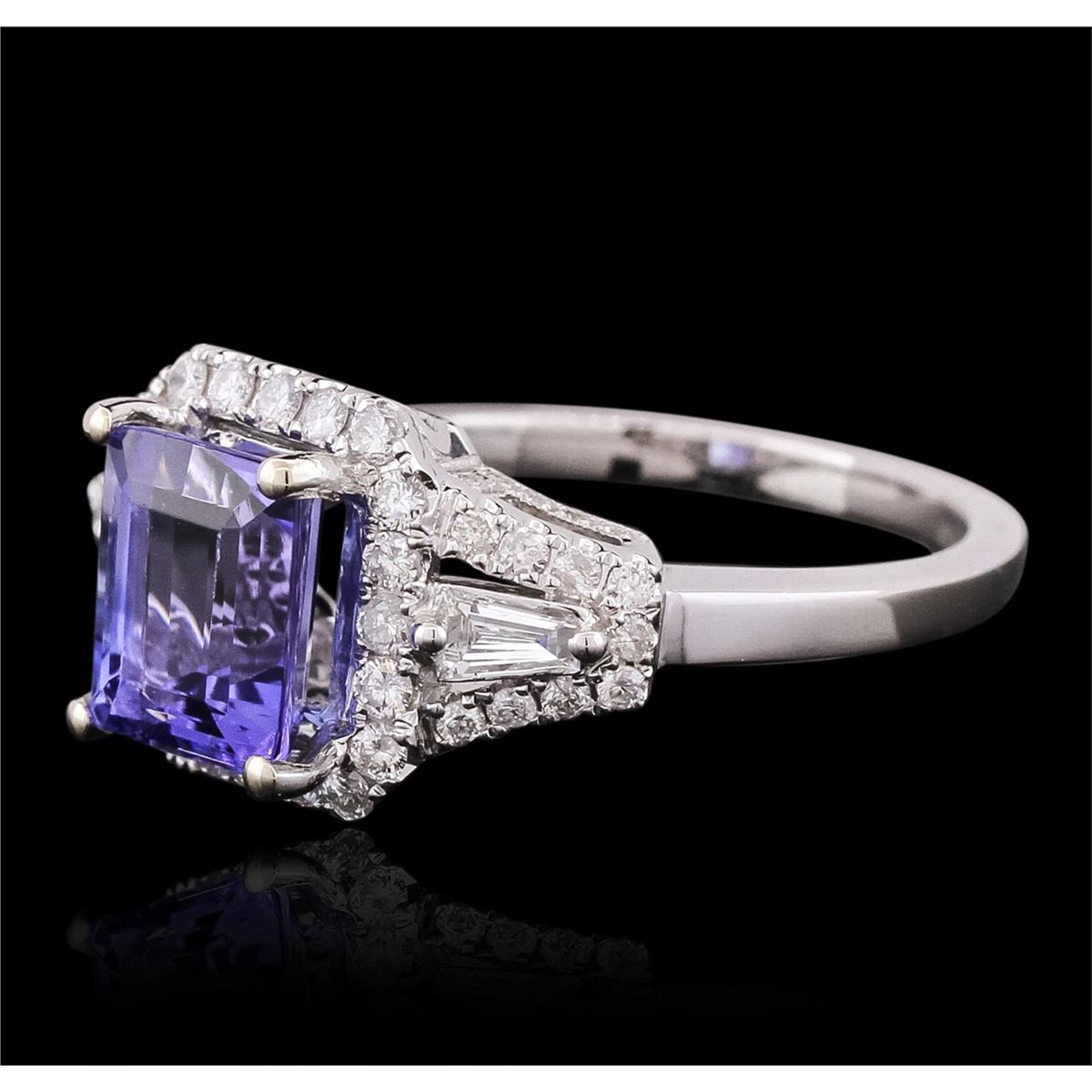 One electronically tested 14KT white gold ladies combination cast & assembled tanzanite and diamond ring with a split shank with a bright polish finish. Identified with markings of "14K". Condition is new. Containing: One prong set emerald standard step cut natural tanzanite, measuring 8.25 x 6.87 x 4.46mm, approximate weight of 2.29ct., clarity is eye clean, type I, medium, very slightly grayish, violet color, (GIA V 5/3), cut is good. Sixty-Eight prong set round brilliant cut diamonds, measuring 1.50 - 1.10 x 0.78mm (depth est.) approximate total weight of 68 Stones = 0.54ct. Clarity: SI-2 to I-1. Color: I - J, Cut is Good. Two prong set baguette cut diamonds, measuring 3.50 x 1.80 x 1.53mm (depth est.) approximate total weight of 2 Stones = 0.18ct. Clarity: SI-1. Color: J, Cut is Good. All colored gemstones are graded in the mounting, unless otherwise stated. All diamonds and colored gemstones are graded in the mounting, unless otherwise stated. Total Weight of Colored Stones 2.29ct. Total Weight of Diamonds 0.72ct. Total Weight of Ring 5.40 grams. GGL Appraised at $6,710.00.