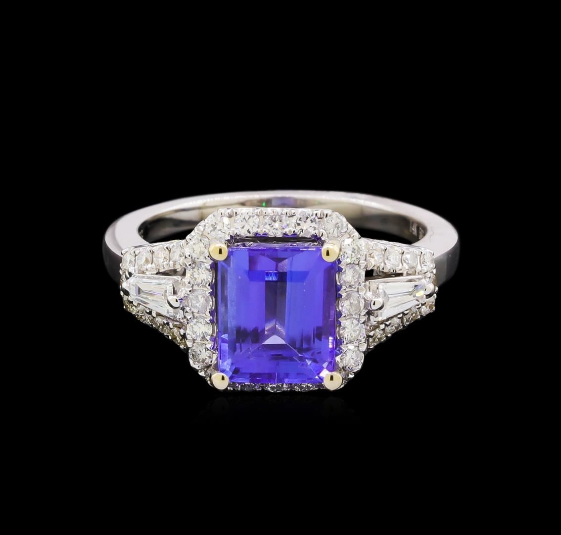 One electronically tested 14KT white gold ladies combination cast & assembled tanzanite and diamond ring with a split shank with a bright polish finish. Identified with markings of "14K". Condition is new. Containing: One prong set emerald standard step cut natural tanzanite, measuring 8.25 x 6.87 x 4.46mm, approximate weight of 2.29ct., clarity is eye clean, type I, medium, very slightly grayish, violet color, (GIA V 5/3), cut is good. Sixty-Eight prong set round brilliant cut diamonds, measuring 1.50 - 1.10 x 0.78mm (depth est.) approximate total weight of 68 Stones = 0.54ct. Clarity: SI-2 to I-1. Color: I - J, Cut is Good. Two prong set baguette cut diamonds, measuring 3.50 x 1.80 x 1.53mm (depth est.) approximate total weight of 2 Stones = 0.18ct. Clarity: SI-1. Color: J, Cut is Good. All colored gemstones are graded in the mounting, unless otherwise stated. All diamonds and colored gemstones are graded in the mounting, unless otherwise stated. Total Weight of Colored Stones 2.29ct. Total Weight of Diamonds 0.72ct. Total Weight of Ring 5.40 grams. GGL Appraised at $6,710.00.