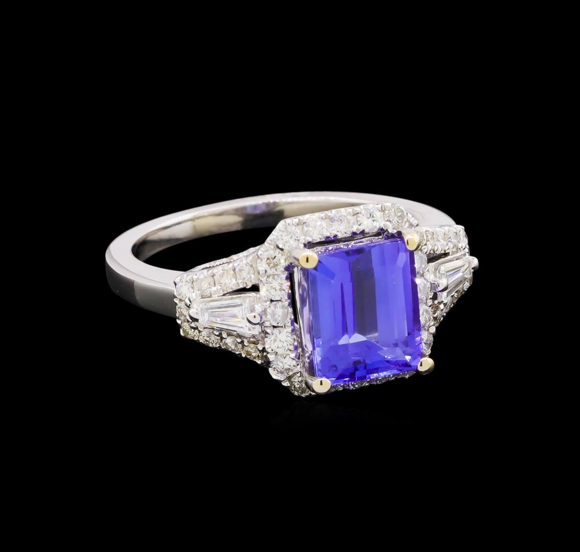 One electronically tested 14KT white gold ladies combination cast & assembled tanzanite and diamond ring with a split shank with a bright polish finish. Identified with markings of "14K". Condition is new. Containing: One prong set emerald standard step cut natural tanzanite, measuring 8.25 x 6.87 x 4.46mm, approximate weight of 2.29ct., clarity is eye clean, type I, medium, very slightly grayish, violet color, (GIA V 5/3), cut is good. Sixty-Eight prong set round brilliant cut diamonds, measuring 1.50 - 1.10 x 0.78mm (depth est.) approximate total weight of 68 Stones = 0.54ct. Clarity: SI-2 to I-1. Color: I - J, Cut is Good. Two prong set baguette cut diamonds, measuring 3.50 x 1.80 x 1.53mm (depth est.) approximate total weight of 2 Stones = 0.18ct. Clarity: SI-1. Color: J, Cut is Good. All colored gemstones are graded in the mounting, unless otherwise stated. All diamonds and colored gemstones are graded in the mounting, unless otherwise stated. Total Weight of Colored Stones 2.29ct. Total Weight of Diamonds 0.72ct. Total Weight of Ring 5.40 grams. GGL Appraised at $6,710.00.