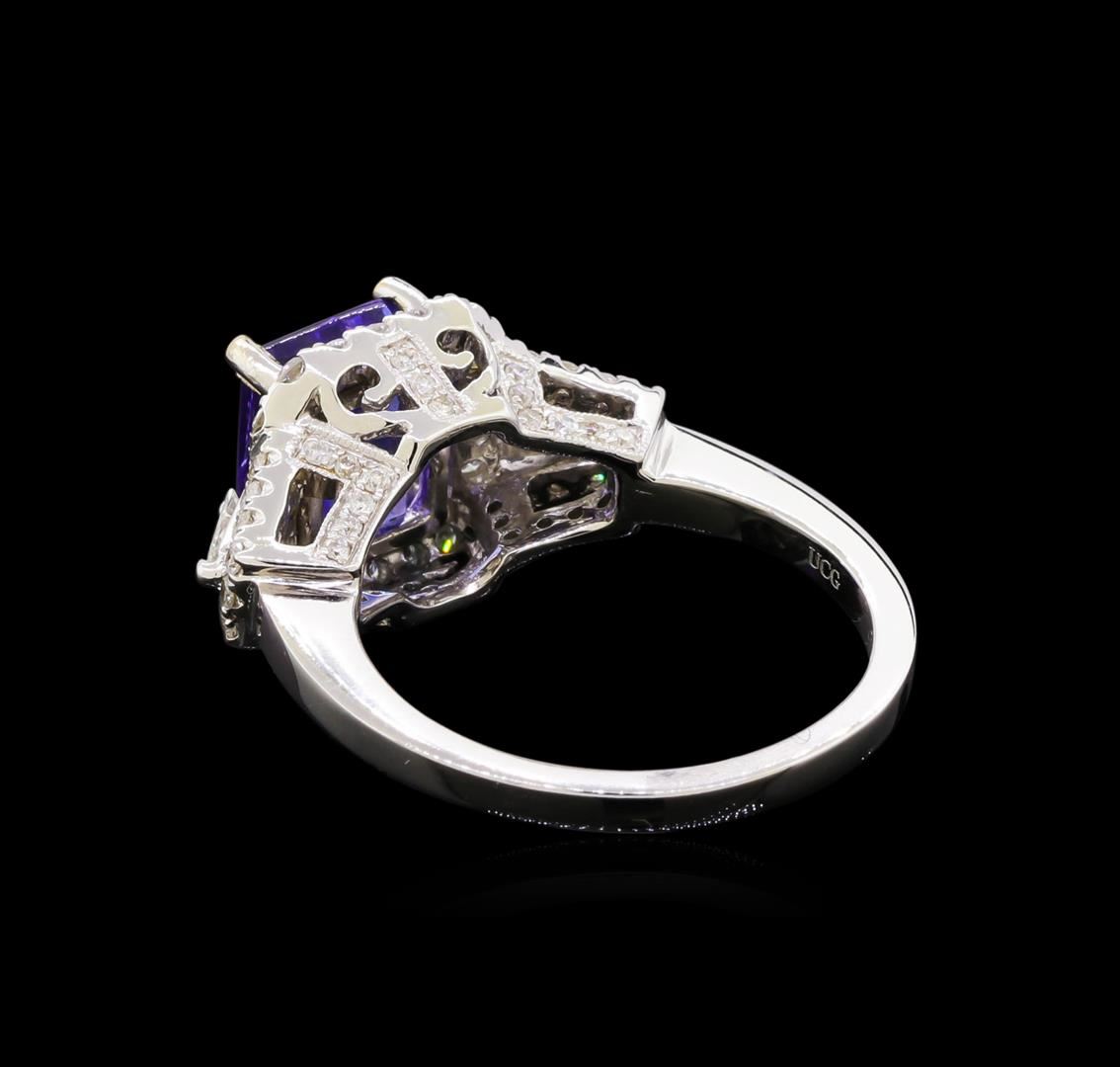 One electronically tested 14KT white gold ladies combination cast & assembled tanzanite and diamond ring with a split shank with a bright polish finish. Identified with markings of "14K". Condition is new. Containing: One prong set emerald standard step cut natural tanzanite, measuring 8.25 x 6.87 x 4.46mm, approximate weight of 2.29ct., clarity is eye clean, type I, medium, very slightly grayish, violet color, (GIA V 5/3), cut is good. Sixty-Eight prong set round brilliant cut diamonds, measuring 1.50 - 1.10 x 0.78mm (depth est.) approximate total weight of 68 Stones = 0.54ct. Clarity: SI-2 to I-1. Color: I - J, Cut is Good. Two prong set baguette cut diamonds, measuring 3.50 x 1.80 x 1.53mm (depth est.) approximate total weight of 2 Stones = 0.18ct. Clarity: SI-1. Color: J, Cut is Good. All colored gemstones are graded in the mounting, unless otherwise stated. All diamonds and colored gemstones are graded in the mounting, unless otherwise stated. Total Weight of Colored Stones 2.29ct. Total Weight of Diamonds 0.72ct. Total Weight of Ring 5.40 grams. GGL Appraised at $6,710.00.