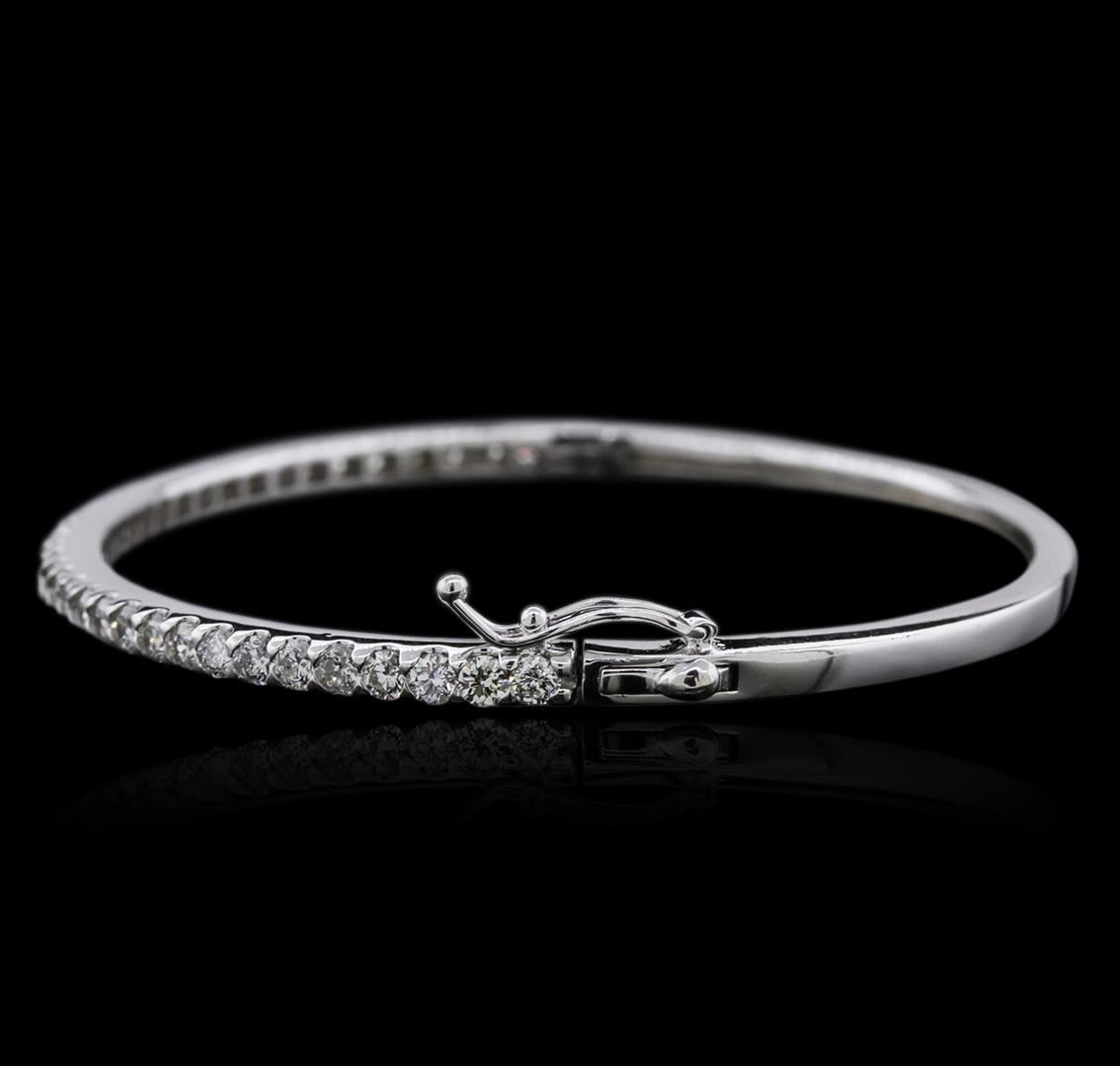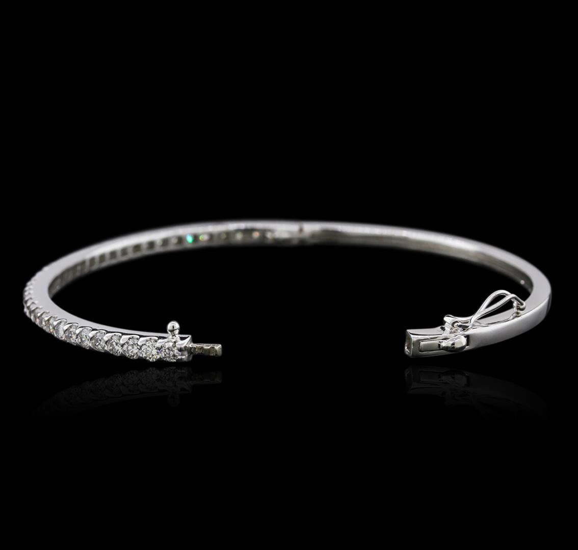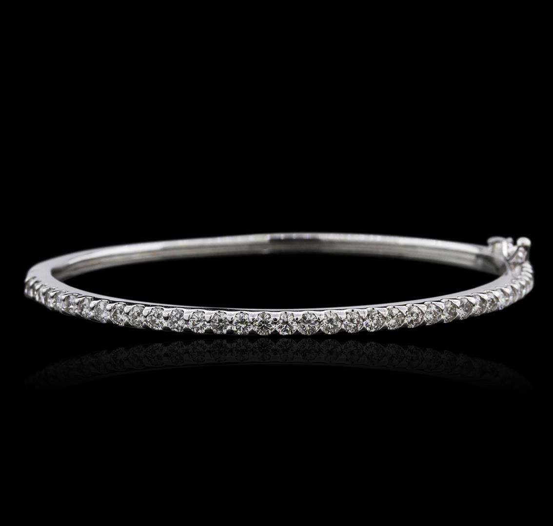 One electronically tested 14KT white gold ladies combination cast & assembled diamond bangle bracelet with a hidden box clasp with safety closer with a bright polish finish. The inside diameter of the bracelet is 2-1/4" wide Condition is new. Containing: Thirty-Six prong set round brilliant cut diamonds, measuring 2.70 - 2.50 x 1.56mm (depth est.) exact total weight 36 Stones = 2.30ct. Clarity: SI-1 to SI-2. Color: I - J, Cut is Good. All diamonds are graded in the mounting, unless otherwise stated. Total Weight of Diamonds 2.30ct. Total Weight of Bangle Bracelet 12.30 grams. GGL Appraised at $5,460.00.