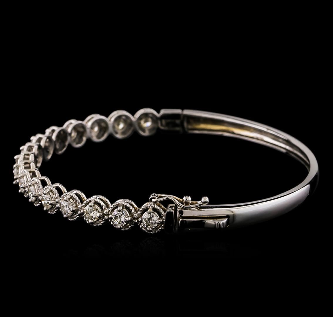 One electronically tested 14KT white gold ladies combination cast & assembled bangle bracelet with a hidden box clasp with a bright polish finish. Condition is new. Identified with markings of "14K". Containing: Sixteen prong set round brilliant cut diamonds, measuring 3.40 - 3.40 x 2.04mm (depth est.) approximate total weight of 16 Stones = 2.30ct. Clarity: SI-2 to I-1. Color: I - J, Cut is Good. All diamonds are graded in the mounting, unless otherwise stated. Total Weight of Diamonds 2.30ct. Total Weight of Bracelet 12.70 grams. GGL Appraised at $9,415.00.
