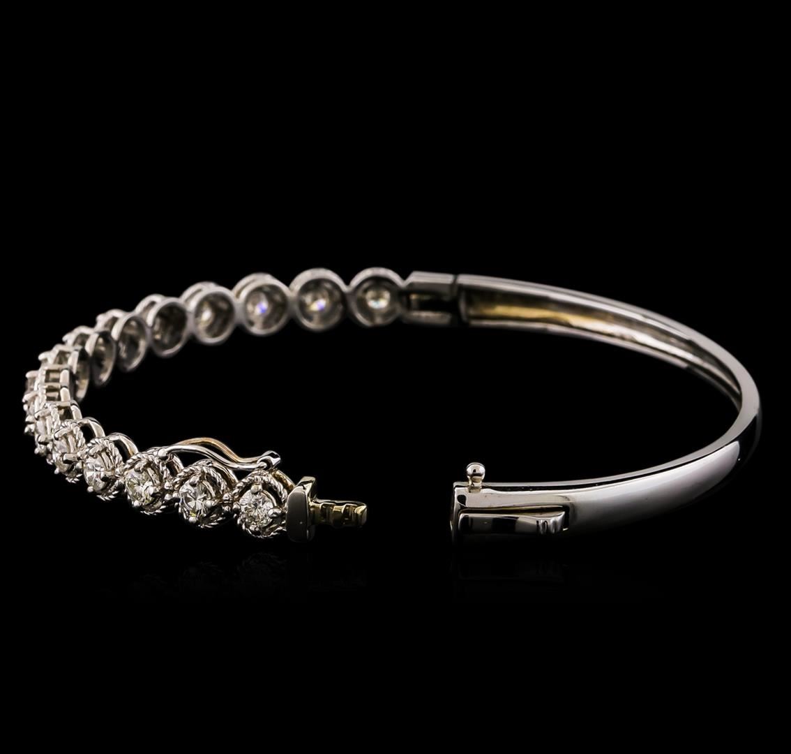 One electronically tested 14KT white gold ladies combination cast & assembled bangle bracelet with a hidden box clasp with a bright polish finish. Condition is new. Identified with markings of "14K". Containing: Sixteen prong set round brilliant cut diamonds, measuring 3.40 - 3.40 x 2.04mm (depth est.) approximate total weight of 16 Stones = 2.30ct. Clarity: SI-2 to I-1. Color: I - J, Cut is Good. All diamonds are graded in the mounting, unless otherwise stated. Total Weight of Diamonds 2.30ct. Total Weight of Bracelet 12.70 grams. GGL Appraised at $9,415.00.