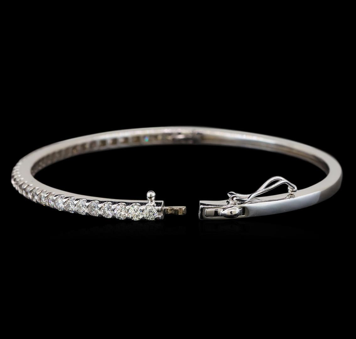 One electronically tested 14KT white gold ladies combination cast & assembled diamond bangle bracelet with a hidden box clasp with safety closer with a bright polish finish. The inside diameter of the bracelet is 2-1/4" wide Condition is new. Containing: Thirty-Six prong set round brilliant cut diamonds, measuring 2.70 - 2.50 x 1.56mm (depth est.) exact total weight 36 Stones = 2.30ct. Clarity: SI-1 to SI-2. Color: I - J, Cut is Good. All diamonds are graded in the mounting, unless otherwise stated. Total Weight of Diamonds 2.30ct. Total Weight of Bangle Bracelet 12.30 grams. GGL Appraised.