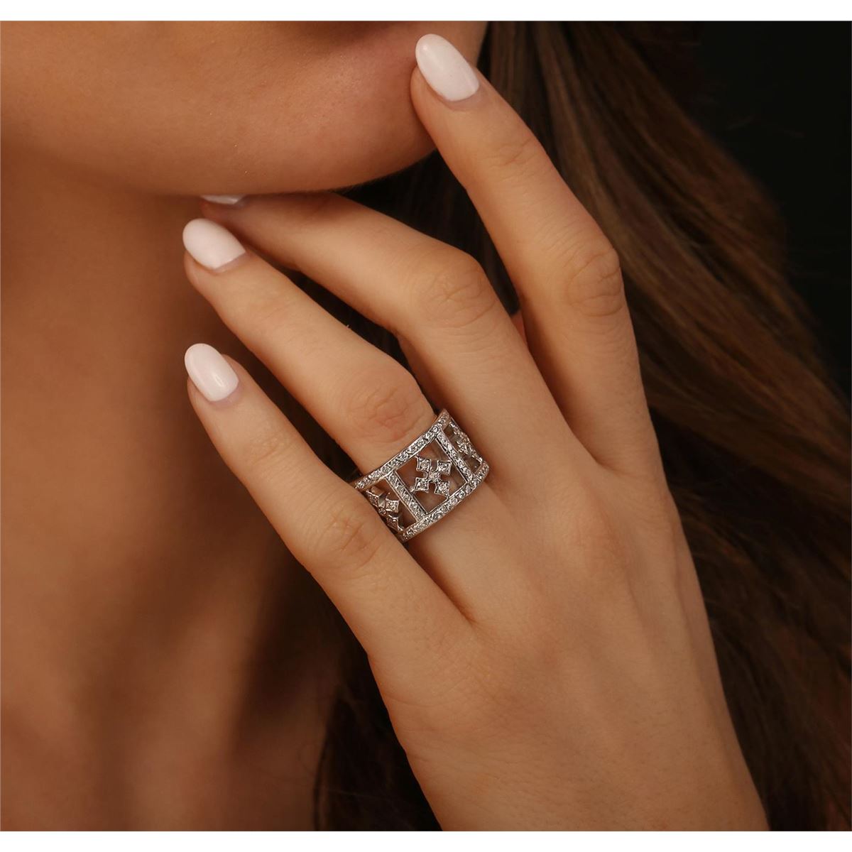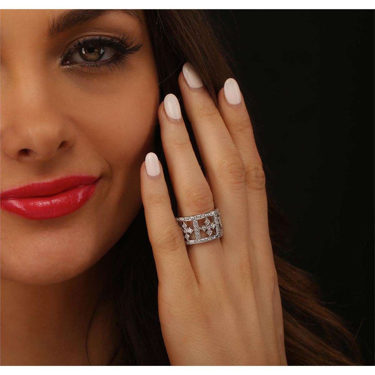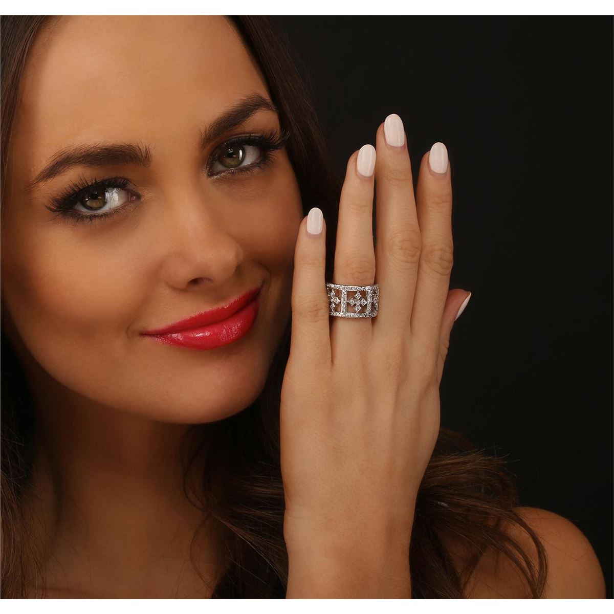 One electronically tested 14KT white gold ladies cast diamond ring with a bright polish finish. Condition is new, good workmanship. The continuous thirteen millimeter wide ring features a diamond set stylized open medieval cross design supported by mirroring diamond ribbons. Identified with markings of "14K". Containing: One Hundred Ninety-Eight bead set round brilliant cut diamonds, measuring 1.50 - 1.40 x 0.87mm (depth est.) approximate. Total Weight of 198 Stones = 2.30ct. The clarity grade reflects the entire range of clarity for this group. Graded in the setting. Clarity: SI-2 to I-3 . Color: G - I. Total Weight of Diamonds 2.30ct.. Total Weight of Ring 12.27 grams. AIG Appraised at $8,170.00.