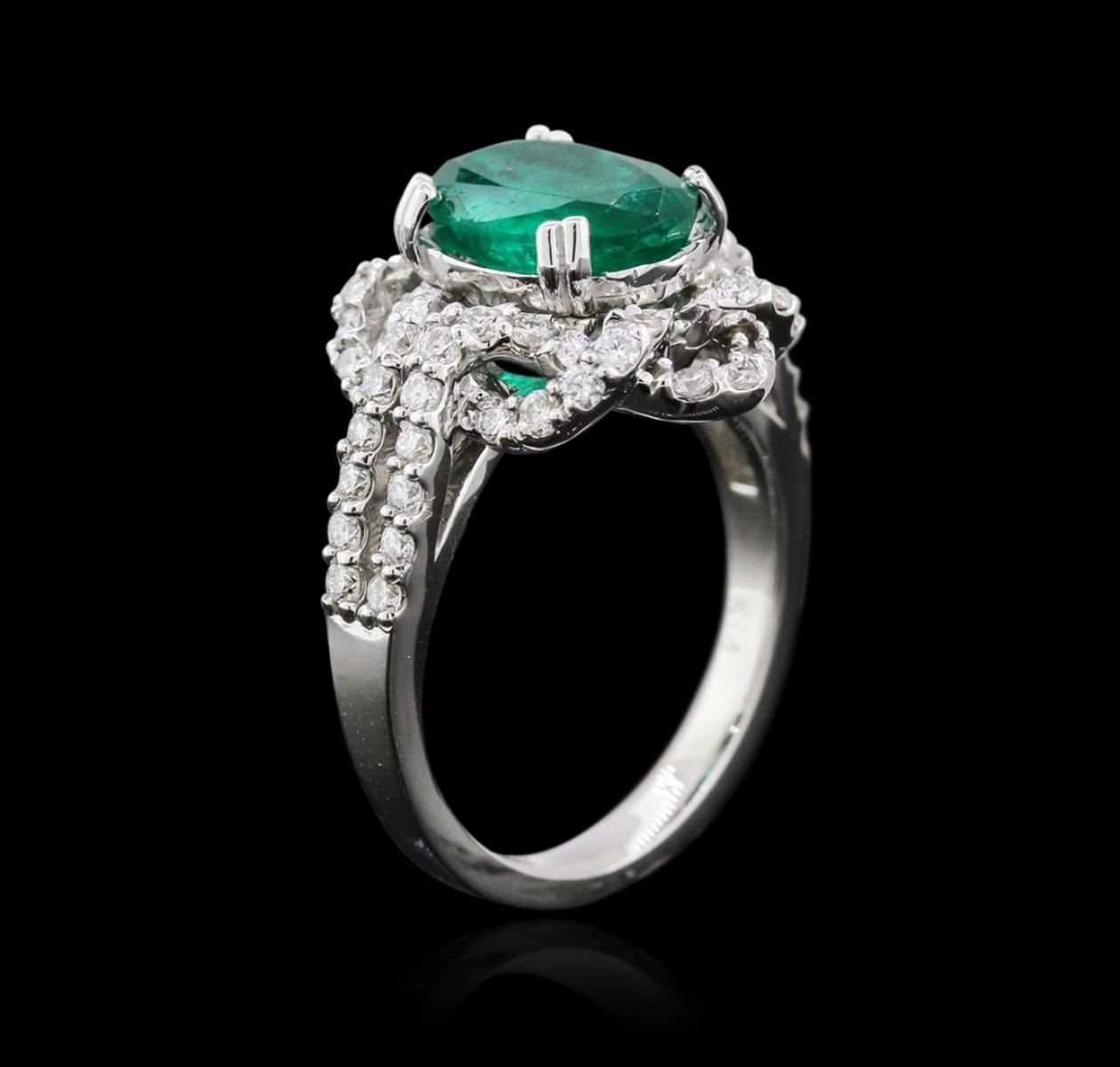 One electronically tested 14KT white gold ladies cast emerald and diamond ring with a split shoulder shank with a bright polish finish. Identified with markings of "K14". Condition is new. Containing: One prong set oval modified brilliant cut natural emerald, measuring 10.25 x 7.70 x 4.26mm, exact weight 2.30ct., clarity is heavily included, type III, medium, moderately strong, green color, (GIA G 5/4), cut is good. Sixty-Two prong set round brilliant cut diamonds, measuring 1.50 - 1.50 x 0.90mm (depth est.) exact total weight 62 Stones = 0.88ct. Clarity: SI-2 to I-2. Color: H - I, Cut is Good. All diamonds and colored gemstones are graded in the mounting, unless otherwise stated. Colored gemstones are presumed to have been subjected to commonly used enhancement processes. Total Weight of Colored Stones 2.30ct. Total Weight of Diamonds 0.88ct. Total Weight of Ring 7.10 grams. GGL Appraised.
