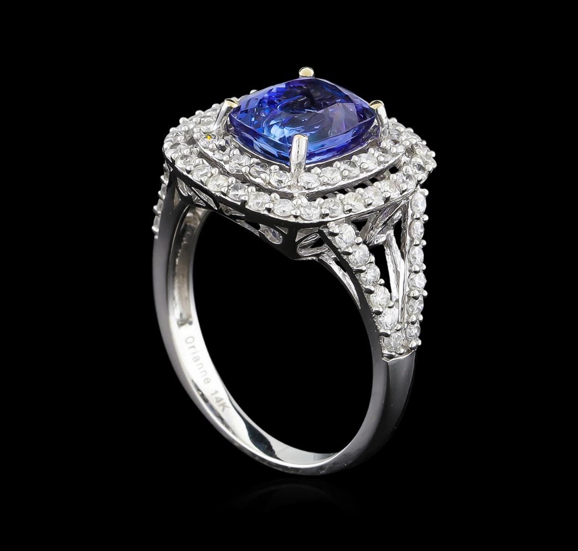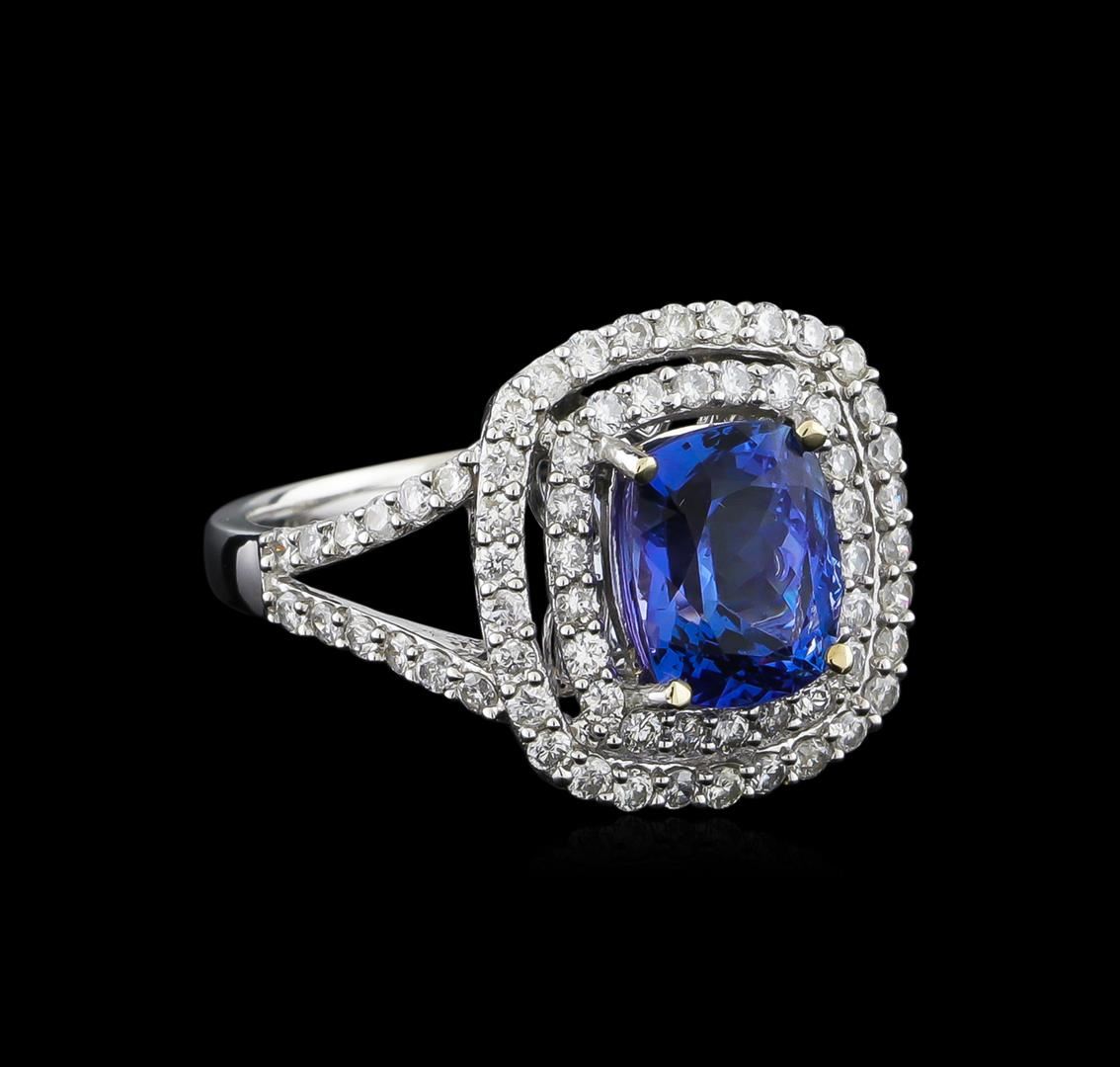 One electronically tested 14KT white gold ladies combination cast & assembled tanzanite and diamond ring with a split shank with a bright polish finish. Identified with markings of "14K". Condition is new. Containing: One prong set rectangular cushion modified brilliant cut natural tanzanite, measuring 8.77 x 7.15 x 4.65mm, approximate weight of 2.30ct., clarity is eye clean, type I, medium light, very slightly grayish, violet color, (GIA V 4/3), cut is good. Seventy-Six prong set round brilliant cut diamonds, measuring 1.30 - 1.30 x 0.78mm (depth est.) approximate total weight of 76 Stones = 0.61ct. Clarity: I-1 to I-2. Color: I - J, Cut is Good. Colored gemstones are presumed to have been subjected to commonly used enhancement processes. All diamonds and colored gemstones are graded in the mounting, unless otherwise stated. Total Weight of Colored Stones 2.30ct. Total Weight of Diamonds 0.61ct. Total Weight of Ring 4.60 grams. GGL Appraised at $6,355.00.