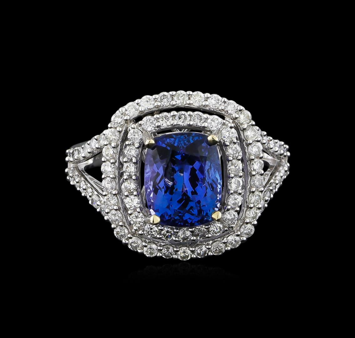 One electronically tested 14KT white gold ladies combination cast & assembled tanzanite and diamond ring with a split shank with a bright polish finish. Identified with markings of "14K". Condition is new. Containing: One prong set rectangular cushion modified brilliant cut natural tanzanite, measuring 8.77 x 7.15 x 4.65mm, approximate weight of 2.30ct., clarity is eye clean, type I, medium light, very slightly grayish, violet color, (GIA V 4/3), cut is good. Seventy-Six prong set round brilliant cut diamonds, measuring 1.30 - 1.30 x 0.78mm (depth est.) approximate total weight of 76 Stones = 0.61ct. Clarity: I-1 to I-2. Color: I - J, Cut is Good. Colored gemstones are presumed to have been subjected to commonly used enhancement processes. All diamonds and colored gemstones are graded in the mounting, unless otherwise stated. Total Weight of Colored Stones 2.30ct. Total Weight of Diamonds 0.61ct. Total Weight of Ring 4.60 grams. GGL Appraised at $6,355.00.