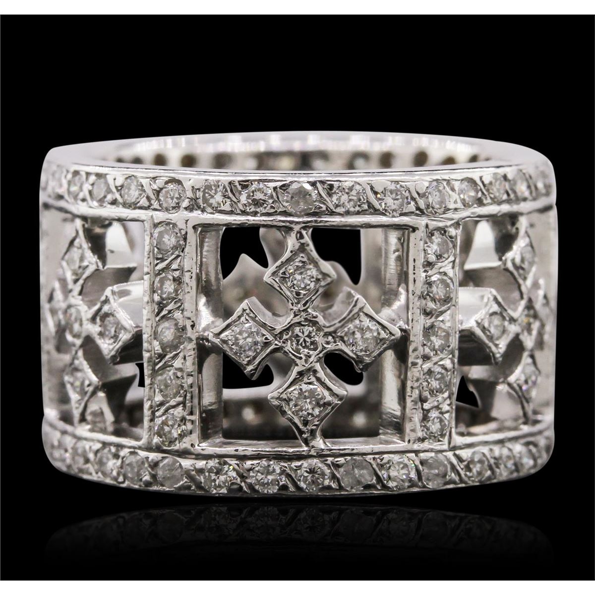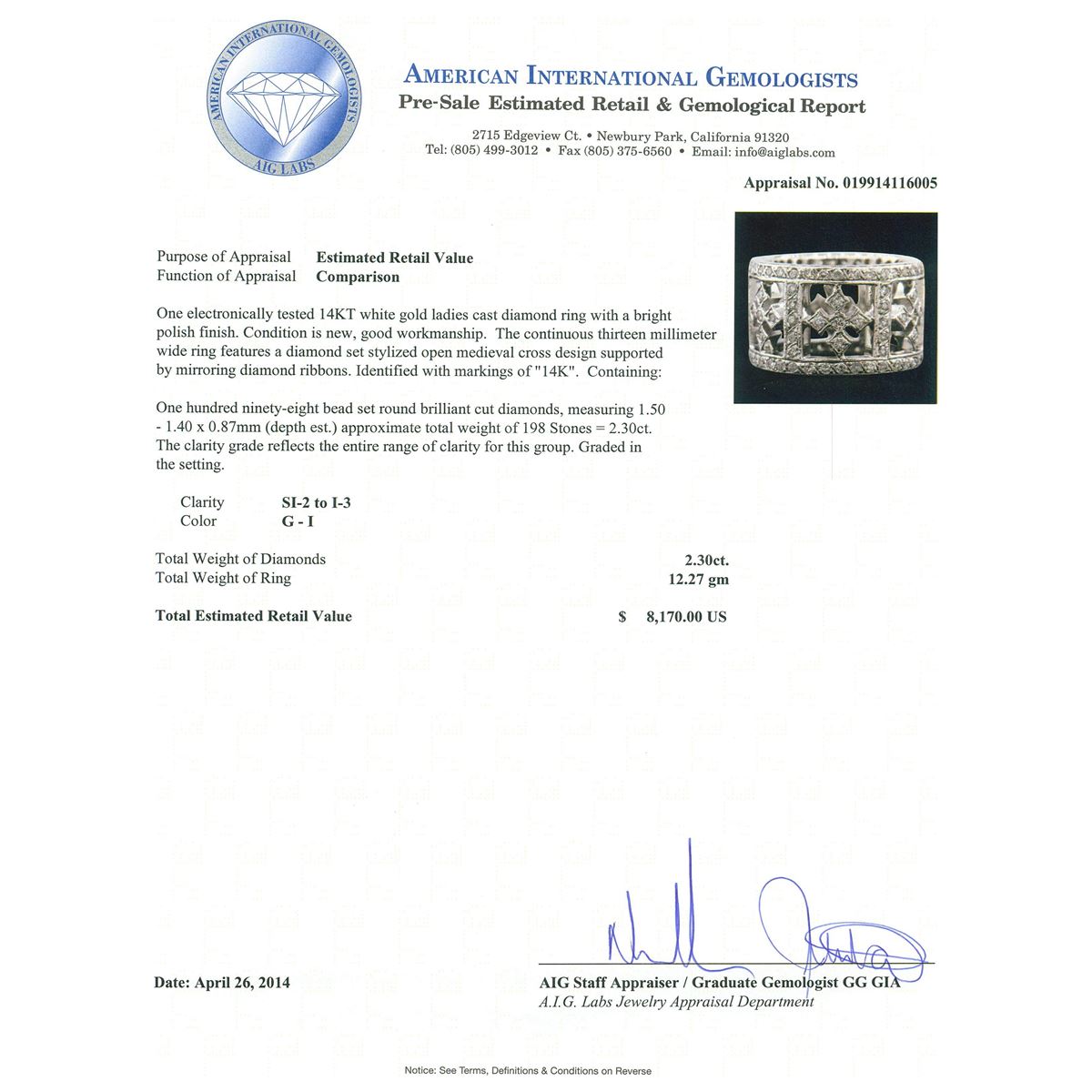 One electronically tested 14KT white gold ladies cast diamond ring with a bright polish finish. Condition is new, good workmanship. The continuous thirteen millimeter wide ring features a diamond set stylized open medieval cross design supported by mirroring diamond ribbons. Identified with markings of "14K". Containing: One Hundred Ninety-Eight bead set round brilliant cut diamonds, measuring 1.50 - 1.40 x 0.87mm (depth est.) approximate. Total Weight of 198 Stones = 2.30ct. The clarity grade reflects the entire range of clarity for this group. Graded in the setting. Clarity: SI-2 to I-3 . Color: G - I. Total Weight of Diamonds 2.30ct.. Total Weight of Ring 12.27 grams. AIG Appraised at $8,170.00.