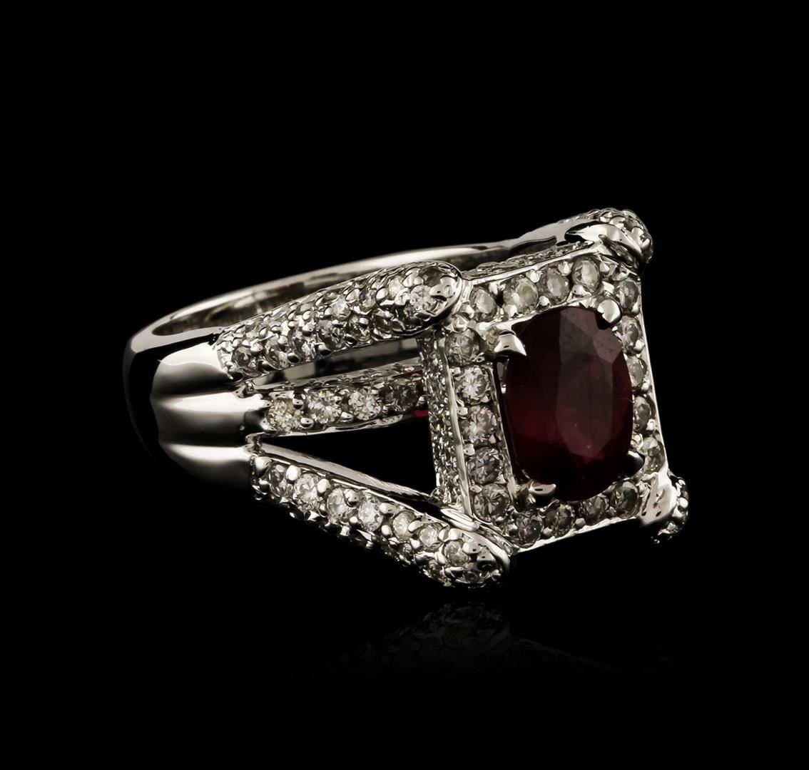 One electronically tested 14KT white gold ladies cast ruby and diamond ring with a bright polish finish. Condition is new. Containing: One prong set oval oval modified brilliant cut natural ruby, measuring 9.20 x 7.20 x 4.15mm, approximate weight of 2.31ct., clarity is heavily included, type II, medium dark, moderately strong, red color, (GIA R 6/4), cut is good. One Hundred Sixty-Eight prong set round brilliant cut diamonds, measuring 1.30 - 1.30 x 0.78mm (depth est.) approximate total weight of 168 Stones = 1.34ct. Clarity: SI-1 to I-1. Color: H - I, Cut is Good. Colored gemstones are presumed to have been subjected to commonly used enhancement processes, All diamonds and colored gemstones are graded in the mounting, unless otherwise stated. Total Weight of Colored Stones 2.31ct. Total Weight of Diamonds 1.34ct. Total Weight of Ring 13.30 grams. GGL Appraised at $7,135.00.