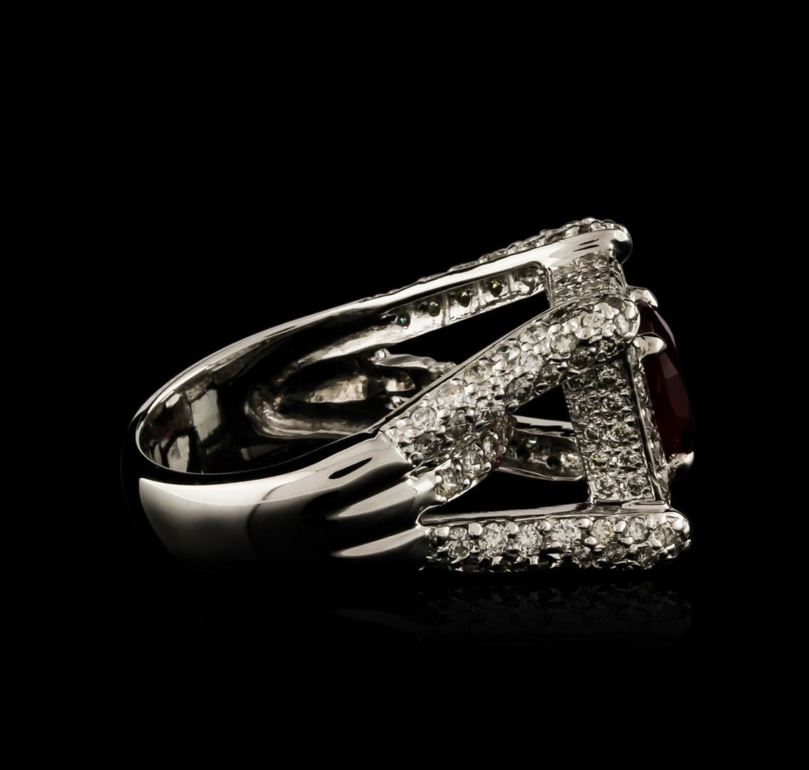 One electronically tested 14KT white gold ladies cast ruby and diamond ring with a bright polish finish. Condition is new. Containing: One prong set oval oval modified brilliant cut natural ruby, measuring 9.20 x 7.20 x 4.15mm, approximate weight of 2.31ct., clarity is heavily included, type II, medium dark, moderately strong, red color, (GIA R 6/4), cut is good. One Hundred Sixty-Eight prong set round brilliant cut diamonds, measuring 1.30 - 1.30 x 0.78mm (depth est.) approximate total weight of 168 Stones = 1.34ct. Clarity: SI-1 to I-1. Color: H - I, Cut is Good. Colored gemstones are presumed to have been subjected to commonly used enhancement processes, All diamonds and colored gemstones are graded in the mounting, unless otherwise stated. Total Weight of Colored Stones 2.31ct. Total Weight of Diamonds 1.34ct. Total Weight of Ring 13.30 grams. GGL Appraised at $7,135.00.