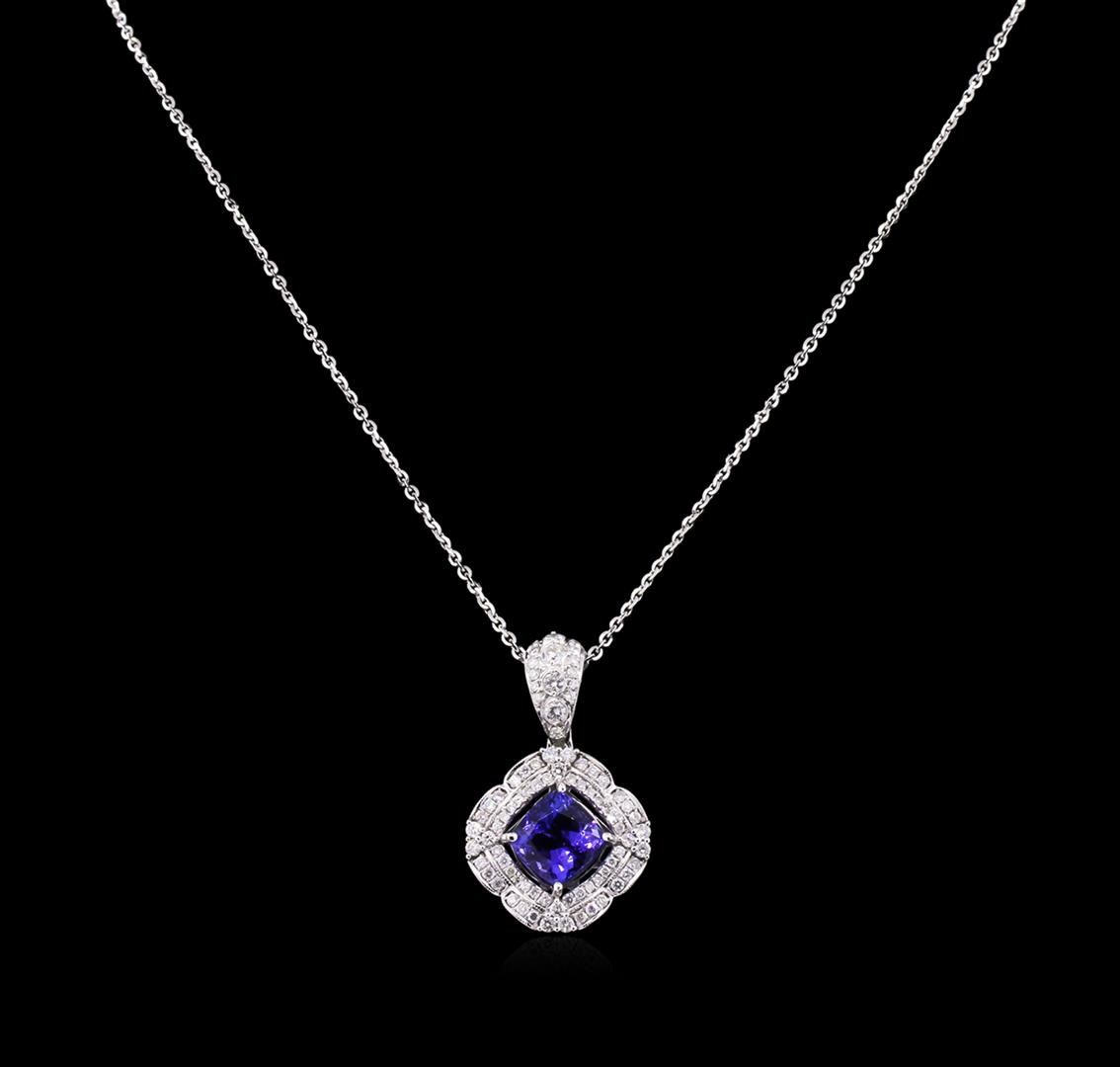 One electronically tested 14KT white gold Ladies combination cast & assembled pendant & chain 17.0" long, medium cable link with a lobster claw clasp with a bright polish finish. Condition is new. Identified with markings of "14K". Containing: One prong set square cushion modified brilliant cut natural tanzanite, measuring 7.78 x 7.56 x 4.99mm, approximate weight of 2.31ct., clarity is eye clean, type I, medium light, moderately strong, bluish violet color, (GIA bV 4/4), cut is very good. Colored gemstones are presumed to have been subjected to commonly used color/clarity enhancement processes. Four prong set round brilliant cut diamonds, measuring 3.00 - 3.00 x 1.80mm (depth est.) approximate. Total Weight of 4 Stones = 0.40ct. Clarity: I-1 to I-2. Color: I - J, Cut is Good. Seventy-Two prong set round brilliant cut diamonds, measuring 1.50 - 1.30 x 0.84mm (depth est.) approximate. Total Weight of 72 Stones = 0.72ct. Clarity: I-1 to I-2. Color: I - J, Cut is Good. Total Weight of Colored Stones 2.31ct. Total Weight of Diamonds 1.12ct. Total Weight of Pendant & Chain 14.60 grams. GGL Appraised at $10,745.00.