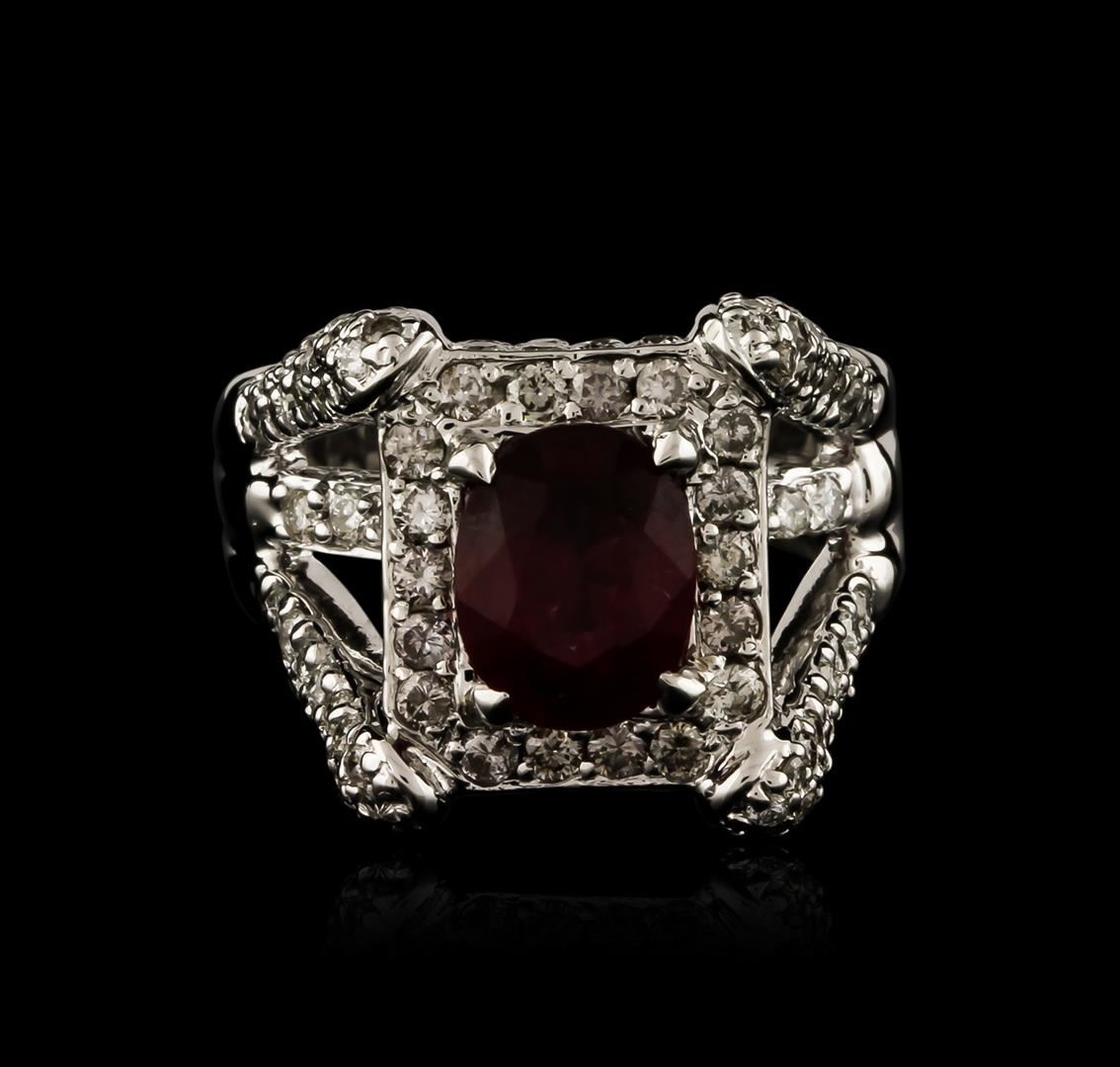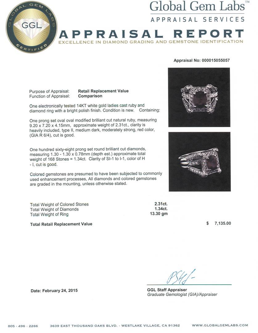 One electronically tested 14KT white gold ladies cast ruby and diamond ring with a bright polish finish. Condition is new. Containing: One prong set oval oval modified brilliant cut natural ruby, measuring 9.20 x 7.20 x 4.15mm, approximate weight of 2.31ct., clarity is heavily included, type II, medium dark, moderately strong, red color, (GIA R 6/4), cut is good. One Hundred Sixty-Eight prong set round brilliant cut diamonds, measuring 1.30 - 1.30 x 0.78mm (depth est.) approximate total weight of 168 Stones = 1.34ct. Clarity: SI-1 to I-1. Color: H - I, Cut is Good. Colored gemstones are presumed to have been subjected to commonly used enhancement processes, All diamonds and colored gemstones are graded in the mounting, unless otherwise stated. Total Weight of Colored Stones 2.31ct. Total Weight of Diamonds 1.34ct. Total Weight of Ring 13.30 grams. GGL Appraised at $7,135.00.