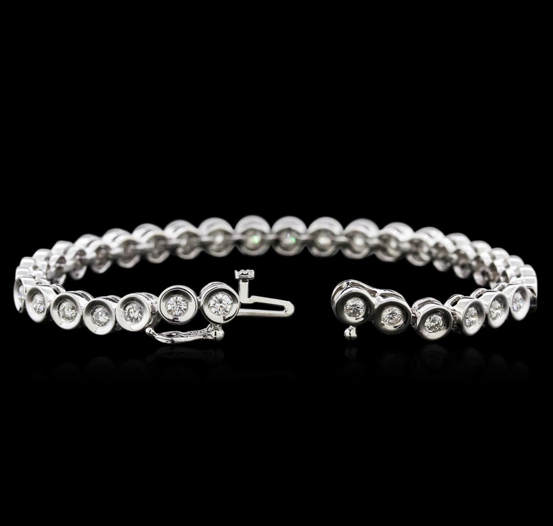 One electronically tested 14KT white gold ladies cast diamond tennis bracelet with a hidden box clasp with safety closer with a bright polish finish. Measurements: 7" in length Identified with markings of "14K". Condition is new. Containing: Thirty-Four bezel set round brilliant cut diamonds, measuring 2.80 - 2.80 x 1.68mm (depth est.) approximate total weight of 34 Stones = 2.32ct. Clarity: SI-1 to I-1. Color: I - J, Cut is Good. Diamonds are graded in the mounting, unless otherwise stated. Total Weight of Diamonds 2.32ct. Total Weight of Tennis Bracelet 17.14 grams. GGL Appraised at $5,350.00.