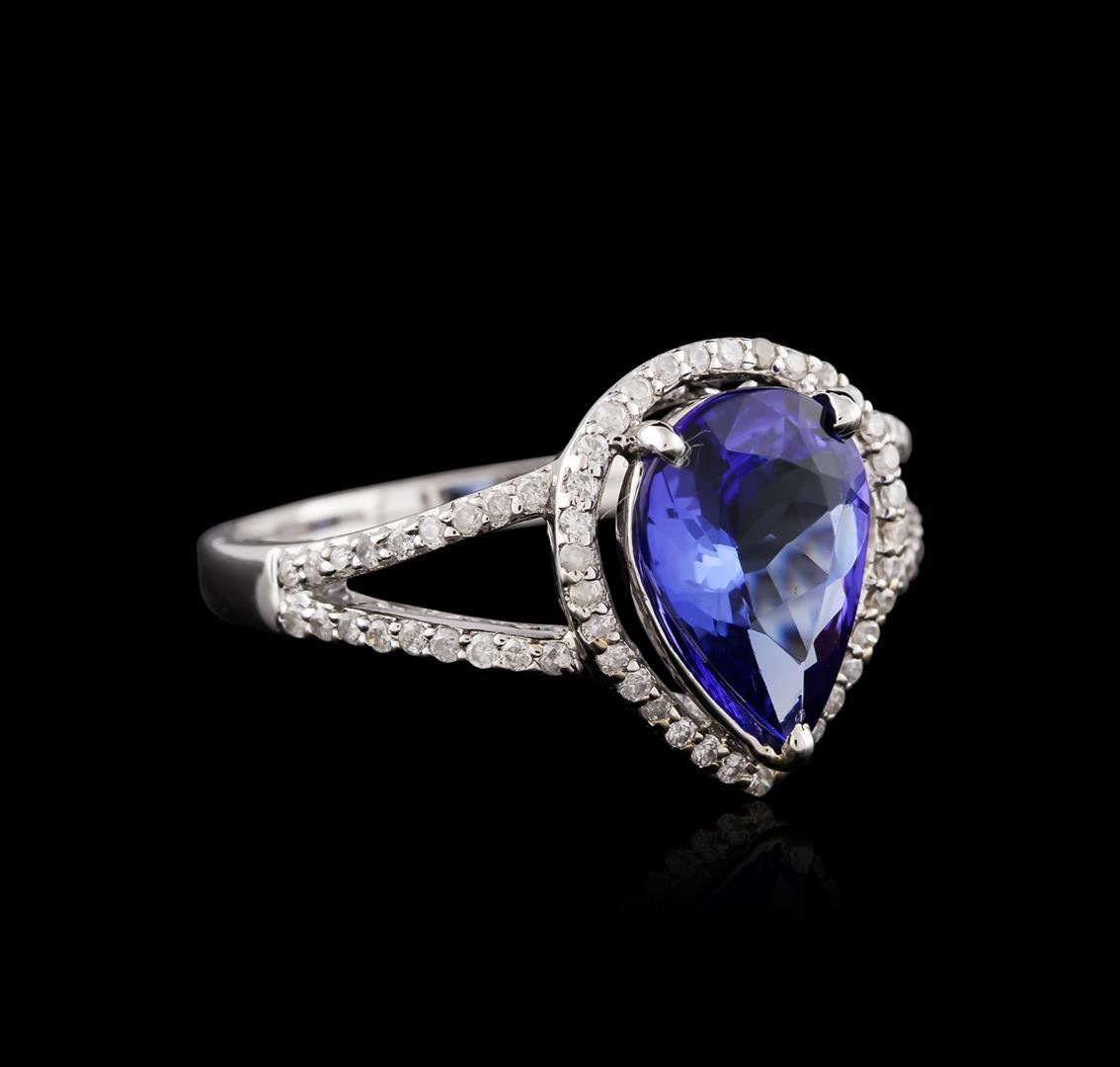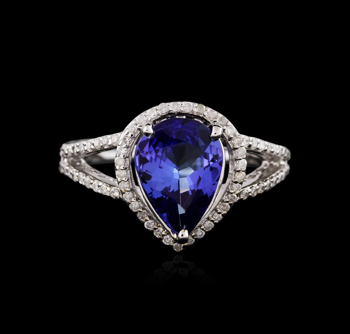 One electronically tested 14KT white gold ladies cast tanzanite and diamond ring with a bright polish finish. Identified with markings of "14K". Condition is new. Containing: One prong set triangle modified brilliant cut natural tanzanite, measuring 10.36 x 7.95 x 4.68mm, approximate weight of 2.32ct., clarity is eye clean, type I, medium light, very slightly grayish, violet color, (GIA V 4/3), cut is good. Sixty-Eight prong set round brilliant cut diamonds, measuring 1.10 - 1.10 x 0.66mm (depth est.) approximate total weight of 68 Stones = 0.33ct. Clarity: I-1 to I-2. Color: I - J. Colored gemstones are presumed to have been subjected to commonly used enhancement processes. All diamonds and colored gemstones are graded in the mounting, unless otherwise stated. Total Weight of Colored Stones 2.32ct. Total Weight of Diamonds 0.33ct. Total Weight of Ring 3.80 grams. GGL Appraised at $3,230.00.