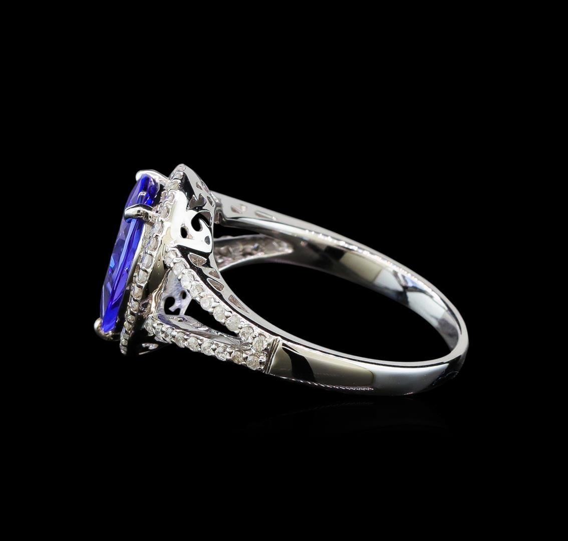 One electronically tested 14KT white gold ladies cast tanzanite and diamond ring with a bright polish finish. Identified with markings of "14K". Condition is new. Containing: One prong set triangle modified brilliant cut natural tanzanite, measuring 10.36 x 7.95 x 4.68mm, approximate weight of 2.32ct., clarity is eye clean, type I, medium light, very slightly grayish, violet color, (GIA V 4/3), cut is good. Sixty-Eight prong set round brilliant cut diamonds, measuring 1.10 - 1.10 x 0.66mm (depth est.) approximate total weight of 68 Stones = 0.33ct. Clarity: I-1 to I-2. Color: I - J. Colored gemstones are presumed to have been subjected to commonly used enhancement processes. All diamonds and colored gemstones are graded in the mounting, unless otherwise stated. Total Weight of Colored Stones 2.32ct. Total Weight of Diamonds 0.33ct. Total Weight of Ring 3.80 grams. GGL Appraised at $3,230.00.