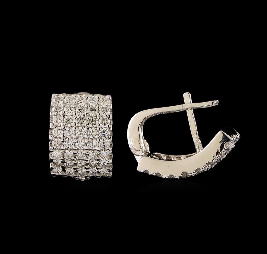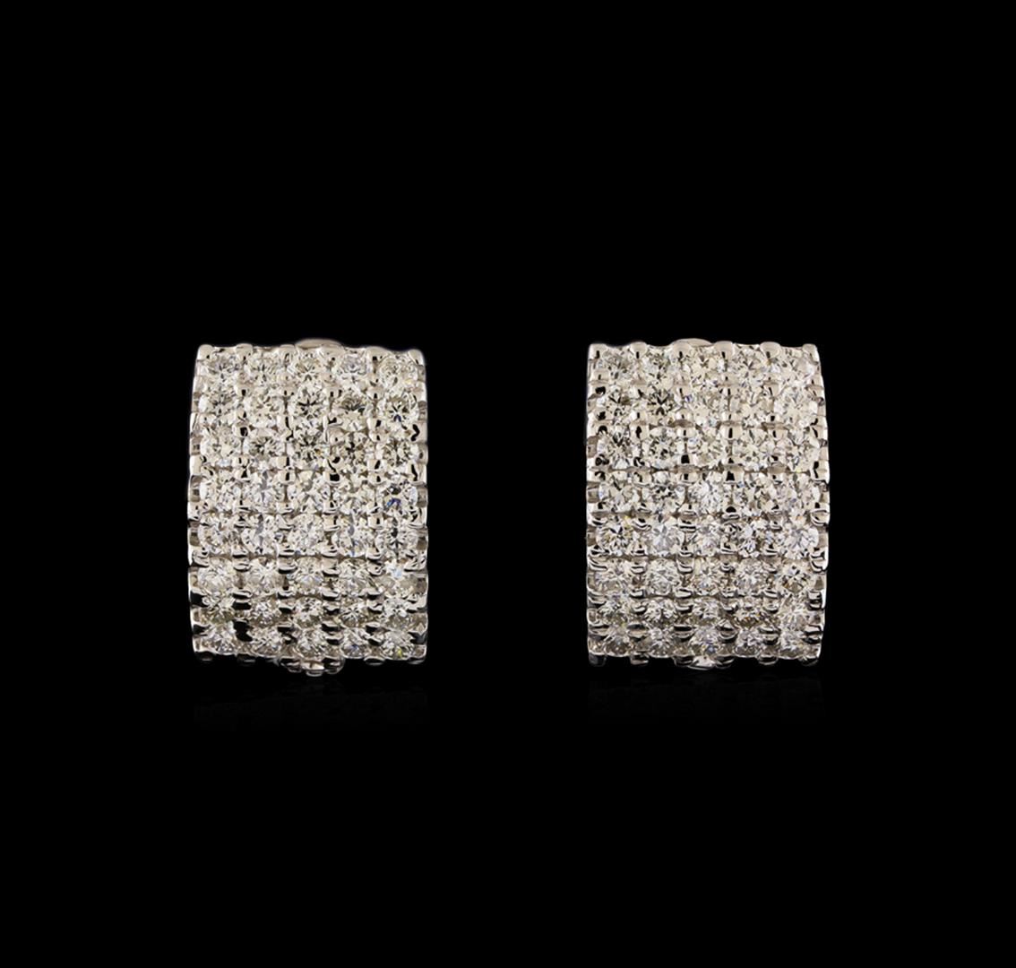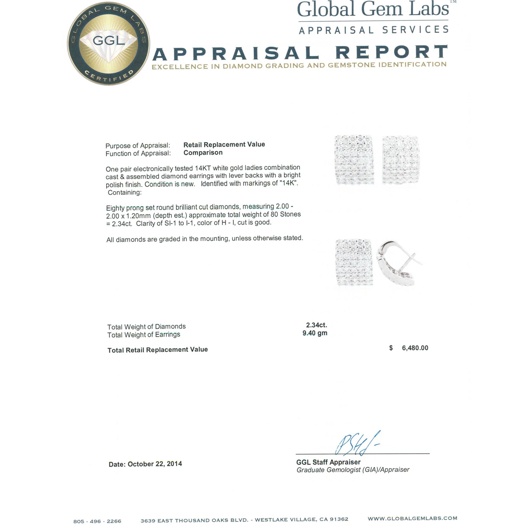 One pair electronically tested 14KT white gold ladies combination cast & assembled diamond earrings with lever backs with a bright polish finish. Identified with markings of "14K". Condition is new. Containing: Eighty prong set round brilliant cut diamonds, measuring 2.00 - 2.00 x 1.20mm (depth est.) approximate total weight of 80 Stones = 2.34ct. Clarity: SI-1 to I-1. Color: H - I, Cut is Good. All diamonds are graded in the mounting, unless otherwise stated. Total Weight of Diamonds 2.34ct. Total Weight of Earrings 9.40 grams. GGL Appraised at $6,480.00.