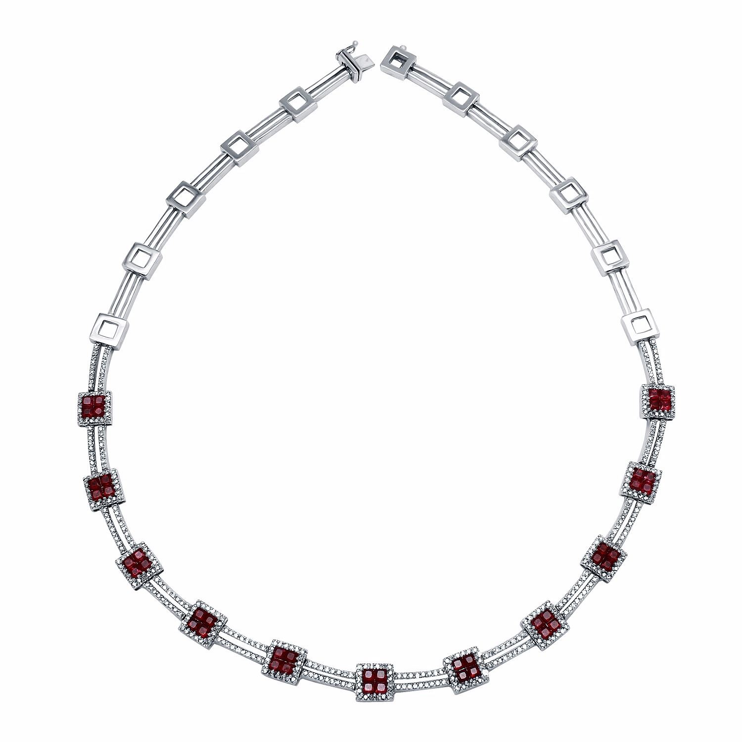 One 14KT White Gold 2.34ctw Ruby and Diamond Necklace. (44) Rubies with a total weight of 2.34cts. (424) Diamonds with a total weight of 2.34cts with a color of I and clarity of SI-1 to SI-2. This necklace has a total weight of 42.82 grams.